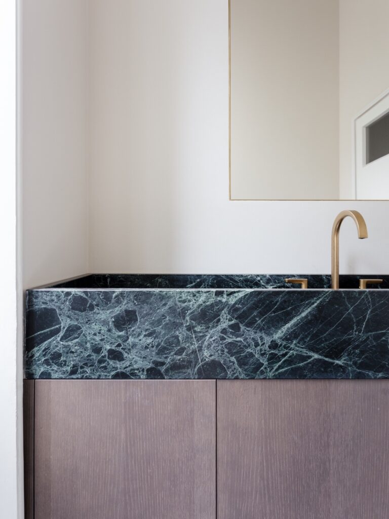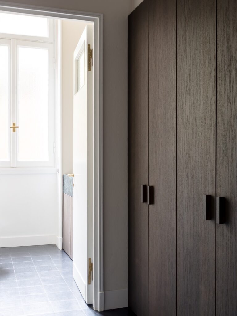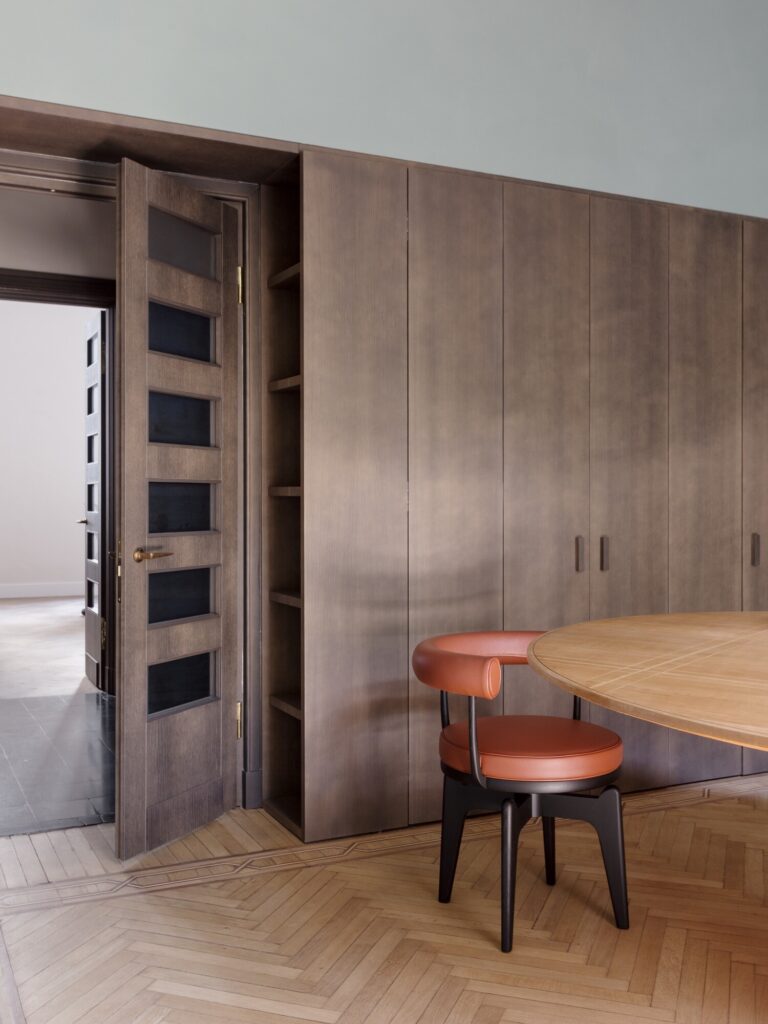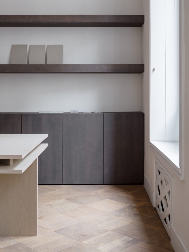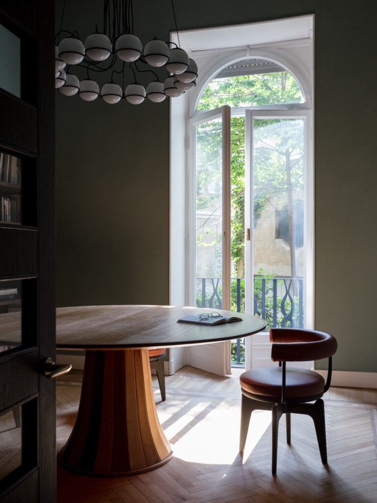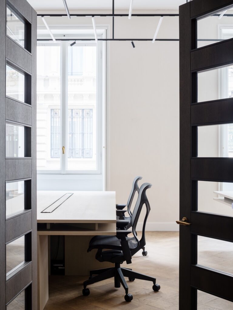 O mobiliário integrado, inteiramente desenhado à medida, define as funções de forma discreta: unidades de arrumação, consolas e mesas de trabalho em freixo branqueado estruturam o espaço sem comprometer a legibilidade histórica dos interiores. Na casa de banho, um amplo lavatório em mármore Verde Alpi ecoa as tonalidades do átrio. A sala de reuniões é enriquecida com clássicos do design: uma mesa dos anos 1940 de Paolo Buffa, cadeiras Indochine de Charlotte Perriand (Cassina) e o candeeiro 2109 de Sarfatti (Astep). A iluminação técnica é assegurada pelo sistema Infra-structure de Vincent Van Duysen (Flos), enquanto o átrio de entrada está pensado para acolher o candeeiro Lenticchia de Peter Zumthor (Viabizzuno).