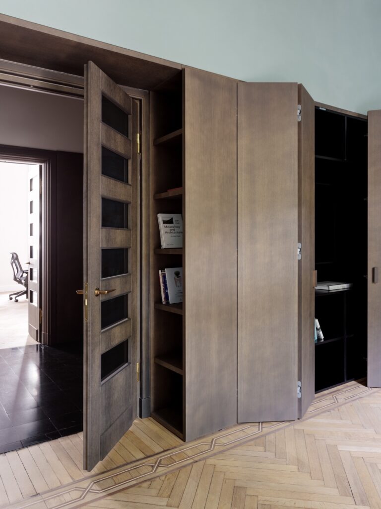 Cada opção de projecto resultou de um diálogo directo com a pré-existência. Os pavimentos originais em carvalho — dispostos em espinha na sala de reuniões e em parquet de losangos de 40 x 40 cm na área de trabalho — foram cuidadosamente recuperados, remontados e integrados sempre que necessário para permitir a introdução de novos sistemas técnicos. Este raro tipo de pavimento, descoberto sob revestimentos posteriores, foi restaurado com extrema atenção ao detalhe. Noutras áreas, surgem cementinas pretas (tradicionais ladrilhos de cimento italianos) que imitam o mármore Belgian Black; onde não foi possível encontrar peças de substituição adequadas, a continuidade foi assegurada através de lajes do próprio mármore, com tonalidade e acabamento correspondentes.