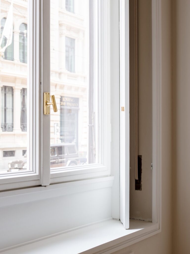 As superfícies murais foram tratadas com uma abordagem quase arqueológica: rebocos e acabamentos decorativos originais dos anos 1930, ocultos sob camadas posteriores, foram revelados, consolidados e reintegrados onde existiam lacunas. Na sala de reuniões, o tom verde das paredes evoca a paleta cromática da época. Janelas, puxadores e dobradiças também foram restaurados: cada elemento metálico foi desmontado, limpo e, em alguns casos, novamente fundido a partir de moldes, revelando a diversidade original de acabamentos em latão e ferro. Estes detalhes, situados entre o Modernismo e o gosto Novecento, testemunham o cuidado de um projecto onde elegância e precisão técnica se cruzam com a cultura material.