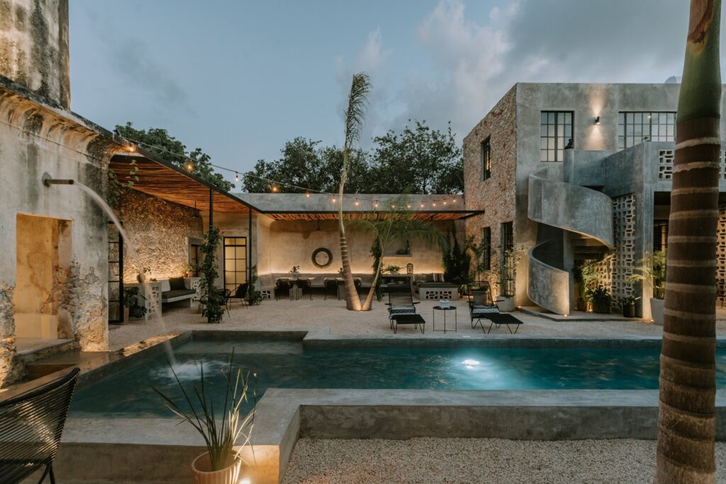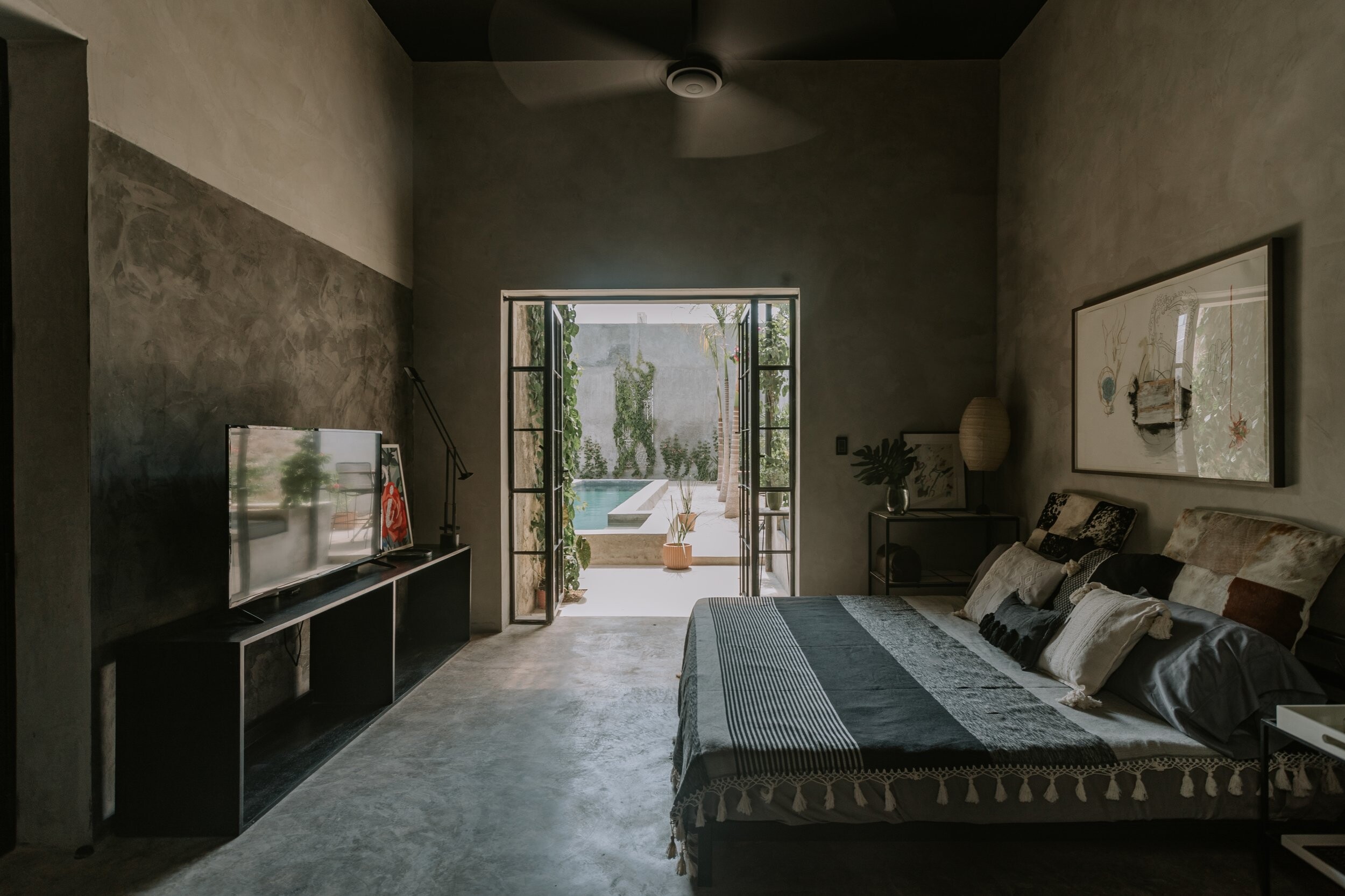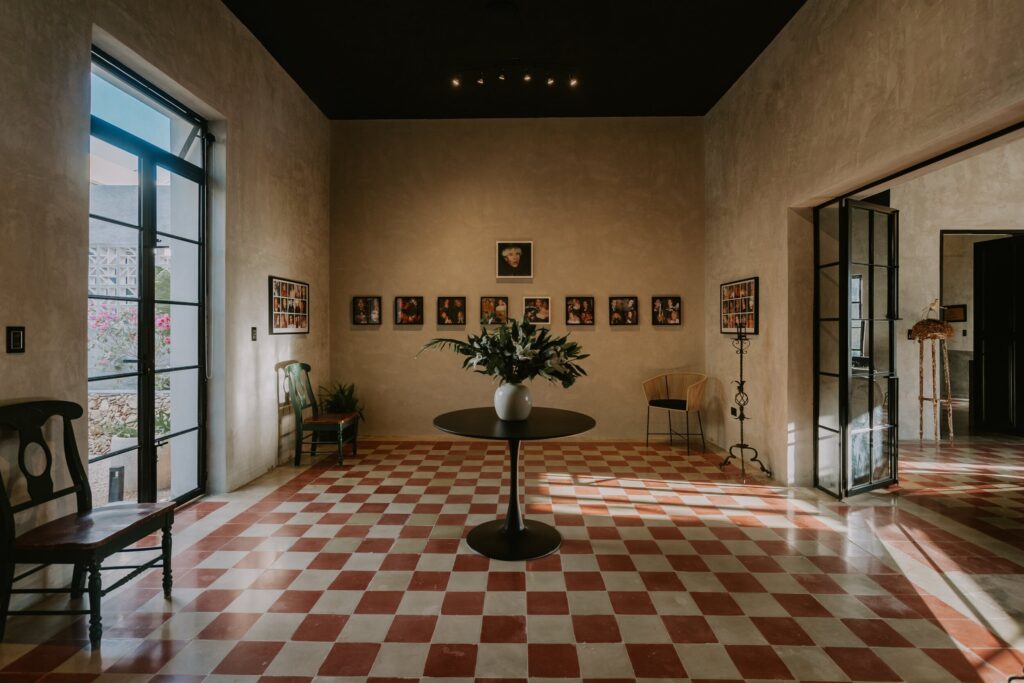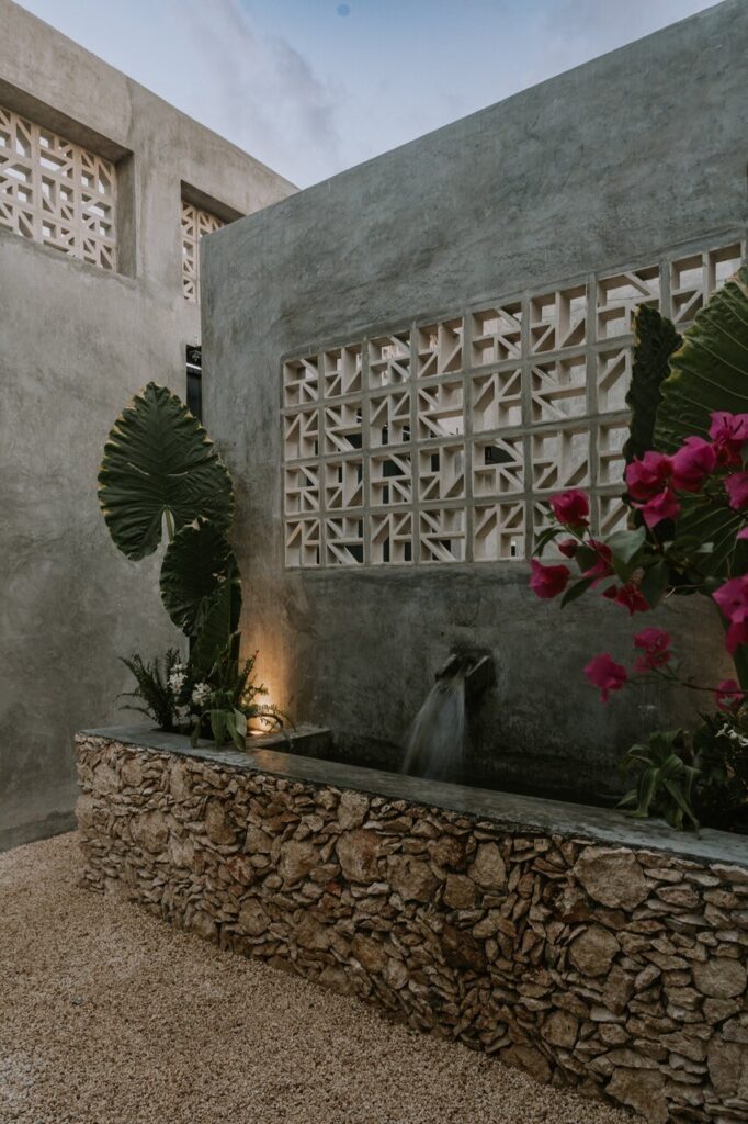 A fachada, marcada pelos eixos da construção antiga, é dividida em três partes, que por sua vez definem a setorização do projeto: a área de serviço à esquerda, a área social ao centro e a área privada à direita. Para enfatizar essa divisão, foram combinados os elementos que compõem a linguagem do projeto: a alvenaria como elemento arquitetónico e decorativo, em tributo ao acabamento pré-existente; os ‘cobogós‘, elementos típicos da linguagem urbana de Mérida (México); e o cimento, amplamente utilizado em todo o projeto.