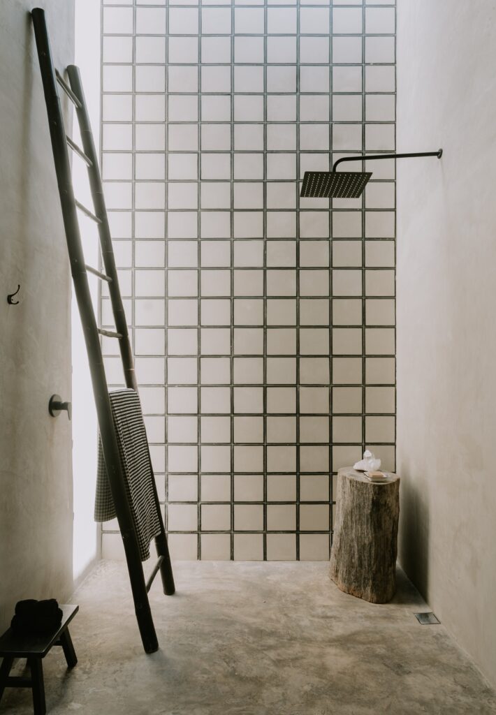 Trabalhando com elementos de privacidade, experiências singulares e a incorporação dos elementos decorativos utilizados no restante do projeto, a casa de banho da suíte, no piso térreo, possui apenas um duche externo, protegido por cobogós e uma porta de serralheria com vidro fosco. No interior, um móvel de cimento com elementos extrudados em três direções emoldura o lavatório. O WC do piso superior é composto por um móvel para o lavatório e uma banheira, também de cimento, destacada por uma parede revestida com mosaicos hidráulicos que abriga o duche.