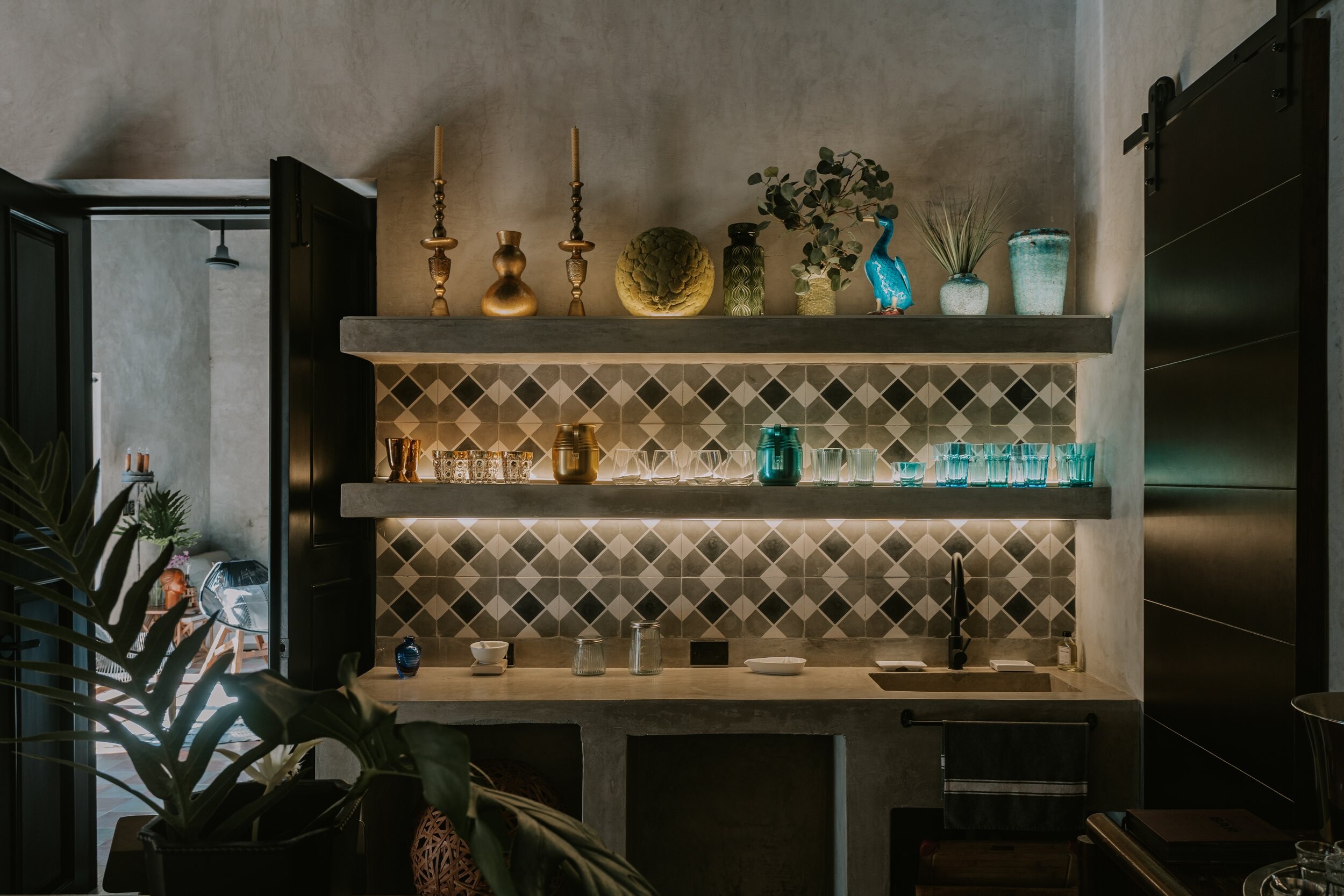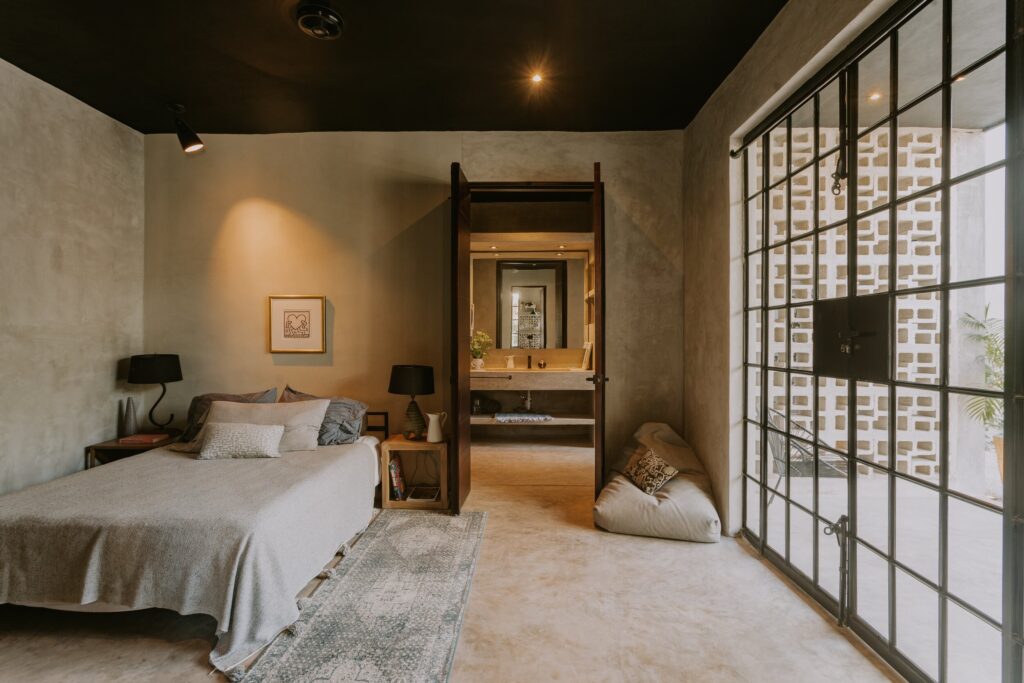 As estruturas e divisões dos ambientes foram, na sua maioria, preservadas e unificadas por meio dos materiais utilizados. Os mosaicos hidráulicos originais em tons de areia e tijolo unem as áreas sociais — hall/galeria/sala de jantar, estar e cozinha. O uso de revestimento à base de cimento nas paredes, assim como a pintura preta nos tetos, une todos os ambientes internos.
