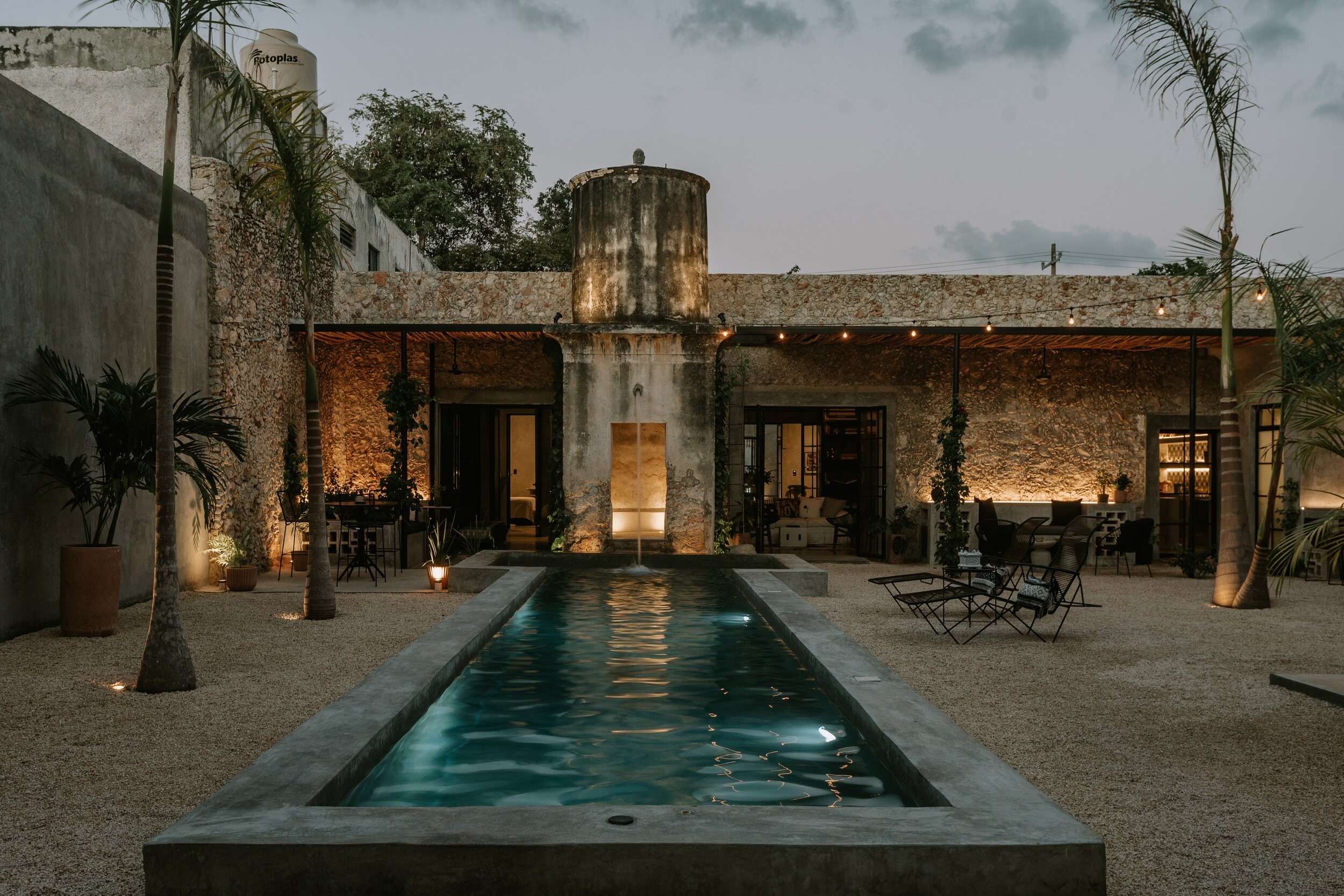 Atravessando a casa principal e no centro do projeto, o jardim social, emoldurado por móveis de cimento e uma pérgola de cipó, separa a construção antiga da nova. A piscina em cimento percorre esse espaço externo, partindo da antiga cisterna, conferindo-lhe destaque. Esta cisterna foi convertida num chuveiro externo de apoio à piscina e, por meio da iluminação instalada, funciona como elemento escultórico. Buganvílias, palmeiras e trepadeiras contrastam com o uso do cimento, de caráter parcialmente brutalista.