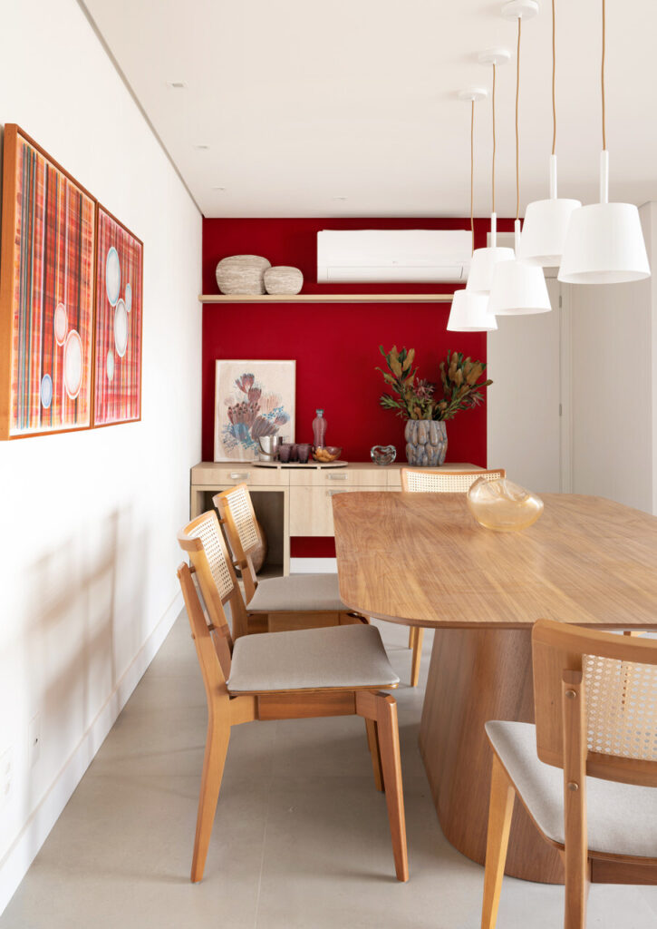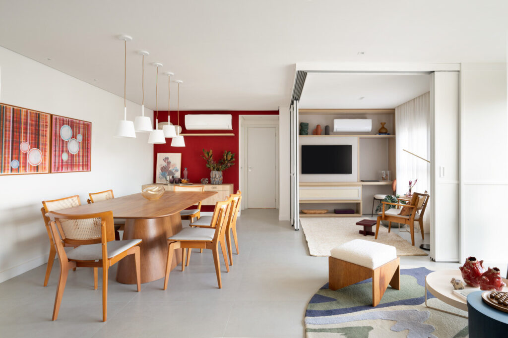 Na paleta de cores, destacam-se o vermelho em quadros e objetos e os tons de azul no tapete de formas orgânicas e nas almofadas. “Acho importante realçar o aspeto afetivo: a moradora associava o vermelho a outros momentos da sua vida e, por isso, a cor foi extremamente valorizada na sala”, afirma Vivi.
