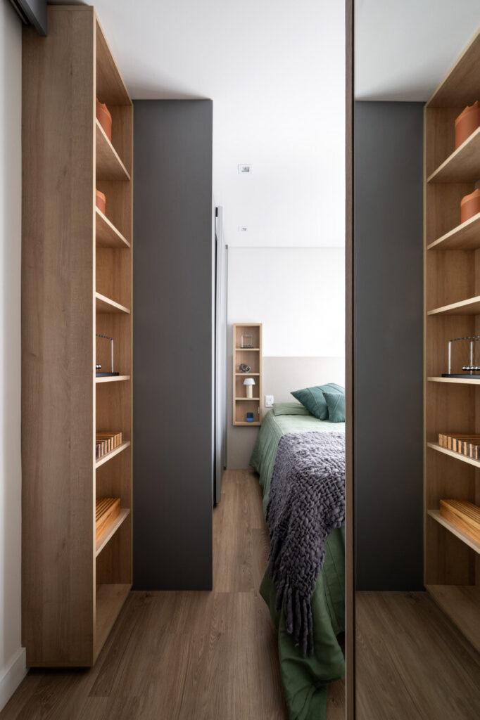 No mobiliário por medida da televisão, um painel de correr permite esconder os materiais de escritório quando não estão a ser utilizados. No dia a dia, isto mantém o ambiente limpo e organizado. “Poder guardar o material de trabalho, não o deixando à vista, traz conforto emocional, pois a nossa casa deve acolher-nos e ajudar-nos a desligar das exigências do trabalho”, explica a arquiteta.