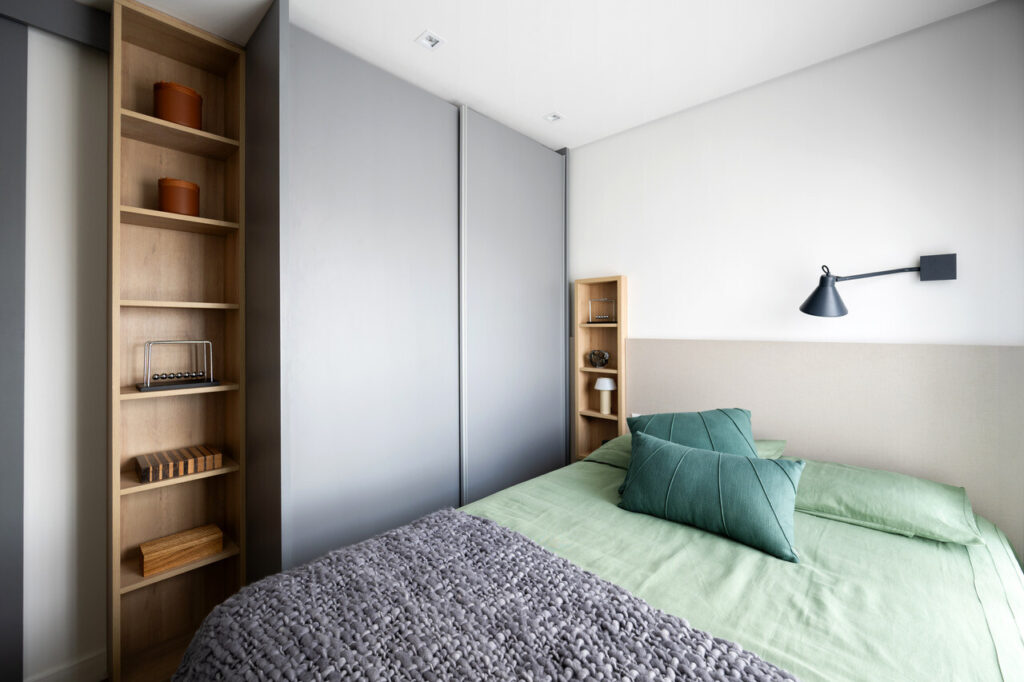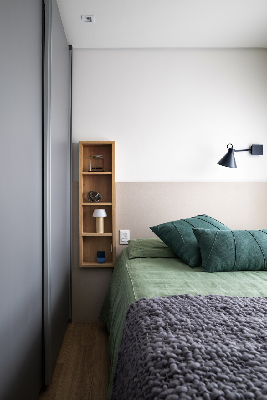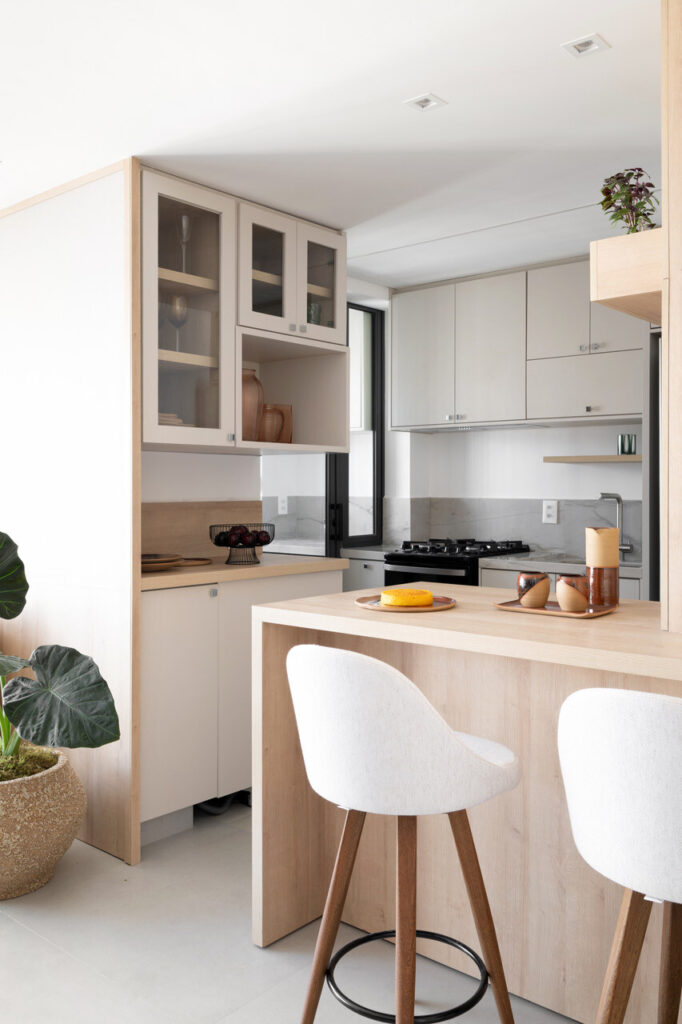 A cozinha, já integrada à sala pela construtora, contribui para a fluidez entre os espaços. Apesar de pequena, conta com uma horta suspensa sobre a bancada de refeições. “É um apartamento sem excessos, onde foi escolhido apenas o essencial e, com isso, as circulações tornaram-se generosas”, completa. O mobiliário em tons claros proporciona amplitude visual em todo o imóvel.