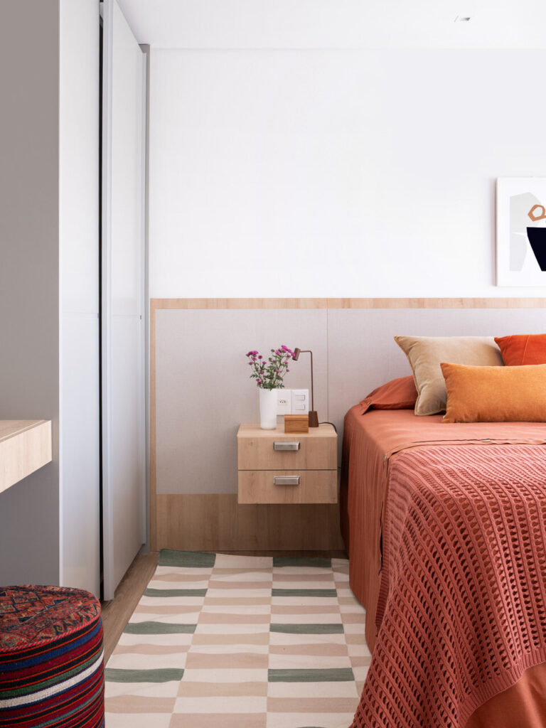 Combinado com tons terrosos, o vermelho também predomina no quarto principal. O destaque vai para o toucador, instalado entre as portas do closet e do armário. O espelho com iluminação lateral garante funcionalidade ao espaço. No quarto do filho, o desejo por uma cama maior foi atendido com a substituição da mesa de cabeceira por um nicho vertical.