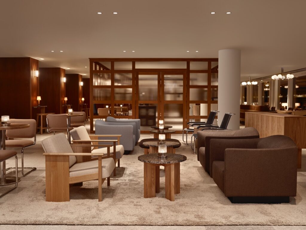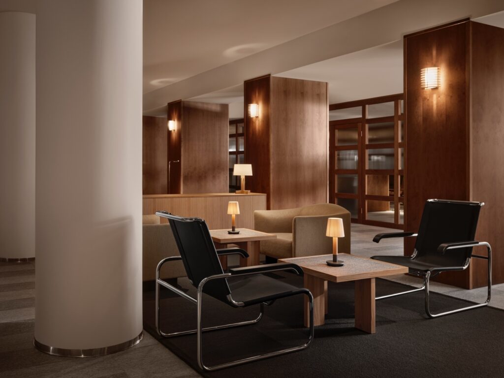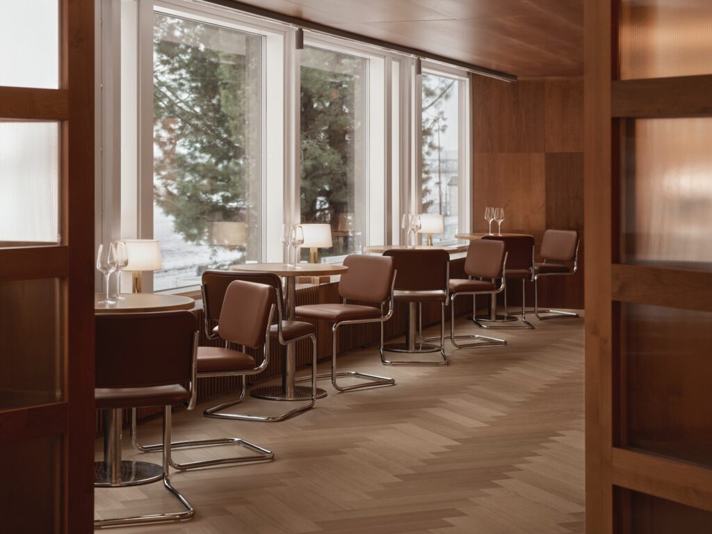 A identidade original de Pohjanhovi guiou o novo conceito. Durante o processo, as camadas acumuladas ao longo do tempo foram removidas e o espaço foi decorado com uma elegância discreta. Elementos originais que refletem a identidade funcionalista do edifício, como os pavimentos do lobby, o balcão e os pilares do restaurante, foram revelados e preservados.