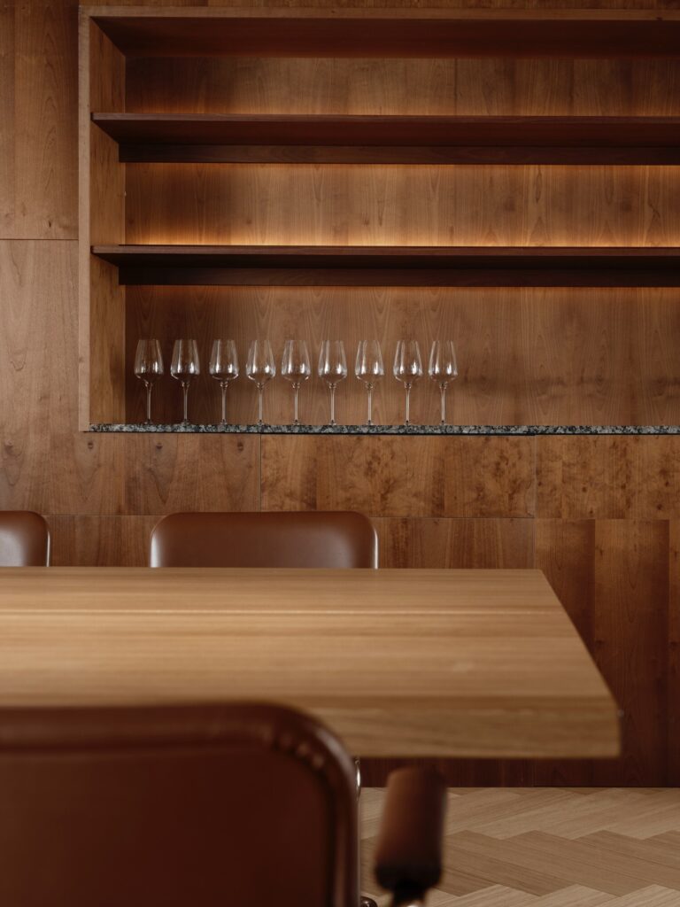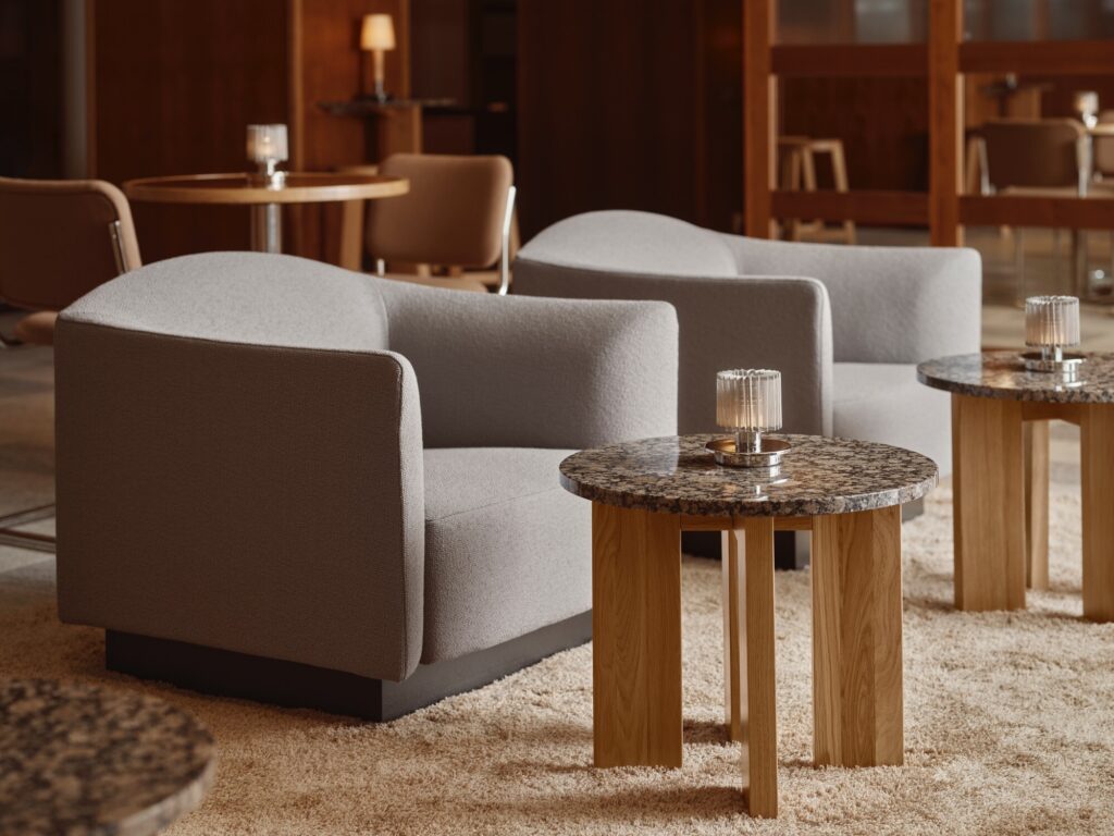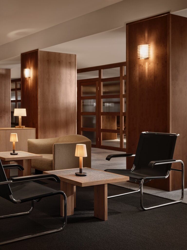 Os apliques de parede existentes foram restaurados e reposicionados para se adequarem ao novo ritmo espacial. Os novos elementos foram selecionados pensando na durabilidade, inspirados nos tons suaves do outono da Lapónia e fundamentados no uso generoso da madeira. Formas claras e materiais autênticos criam um ritmo calmo e contemporâneo.