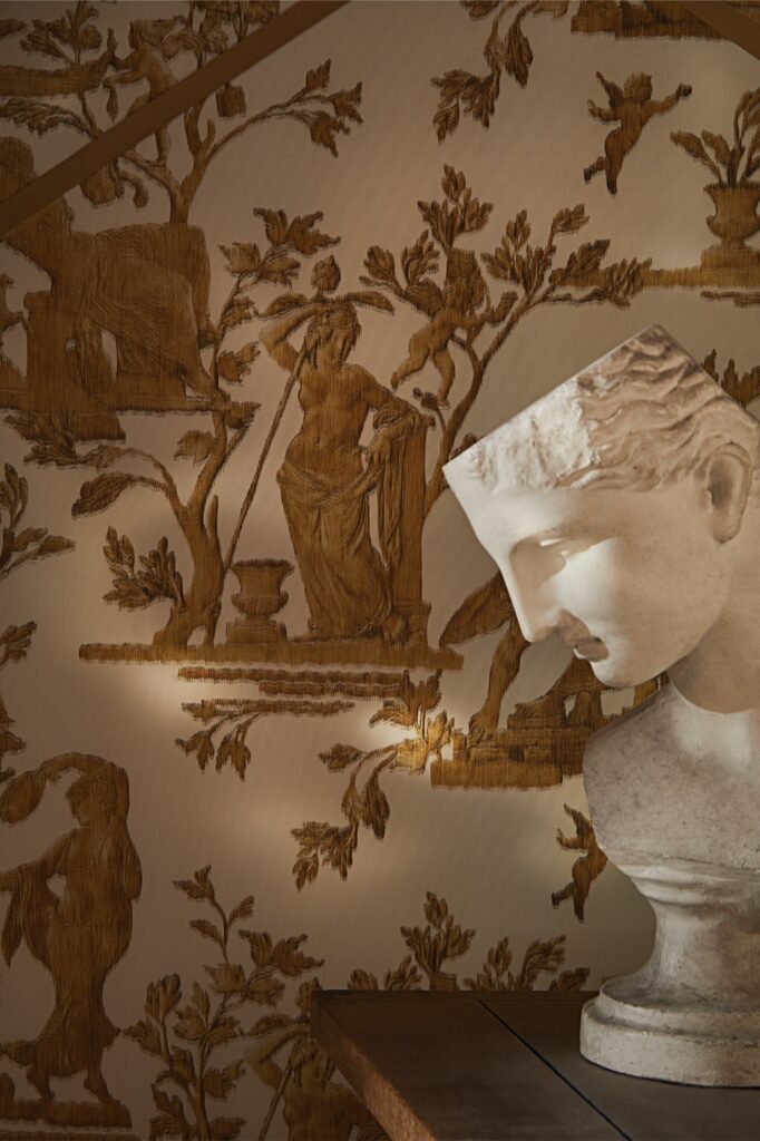 Os motivos desenvolvem-se com contenção, evocando sucessivamente a delicadeza vegetal das antigas decorações murais, o rigor ornamental dos mosaicos e a sensualidade contida dos interiores clássicos. Grinaldas, folhagens, arabescos e composições geométricas surgem suavemente patinados pelo tempo, sem nunca resvalar para a citação literal. Os tecidos sugerem mais do que ilustram, abrindo espaço a uma leitura contemporânea e sensível de referências antigas.