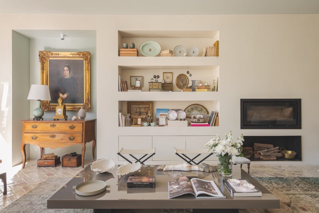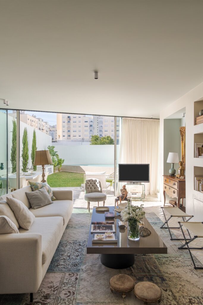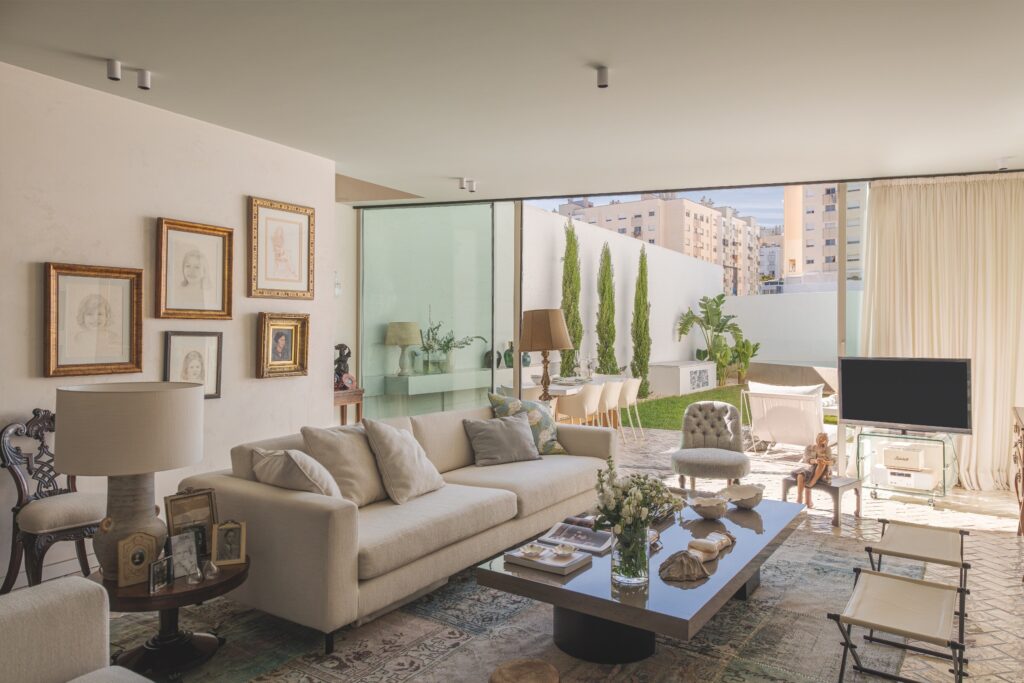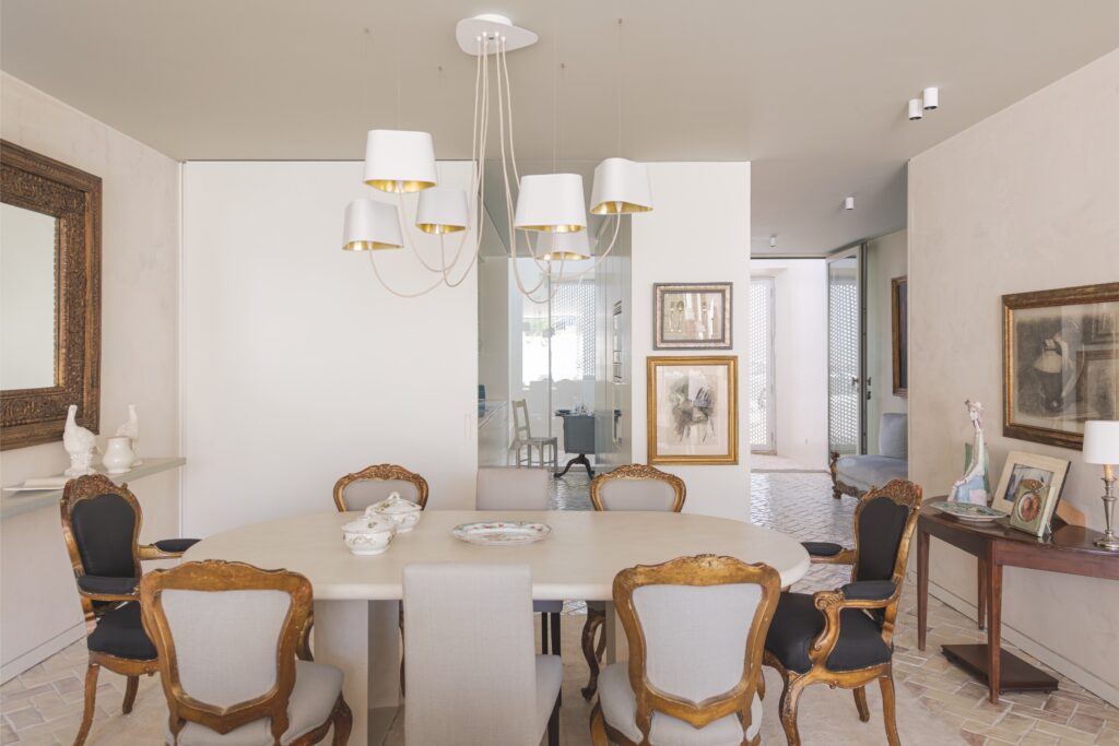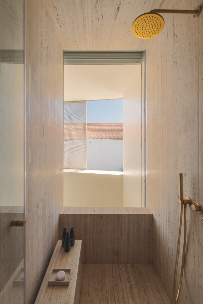 Os acabamentos revelam o cuidado em cada detalhe: o chão em tijoleira manual vidrada, em tom de manteiga, prolonga-se até ao jardim, e as casas de banho revestidas a travertino — material preferido da dona da casa — conferem textura e luz.