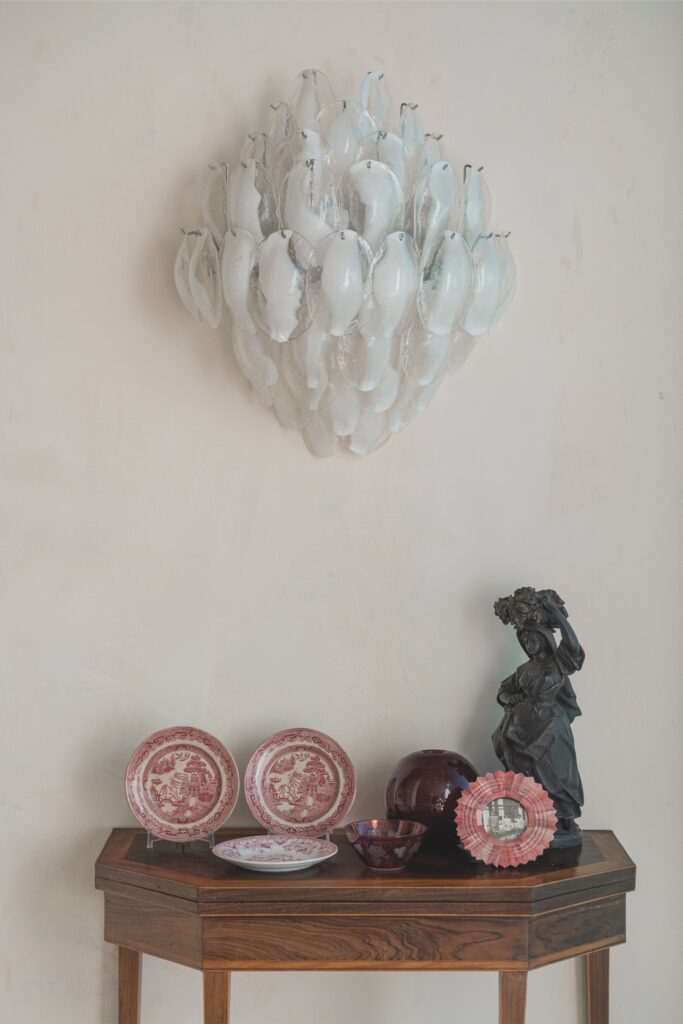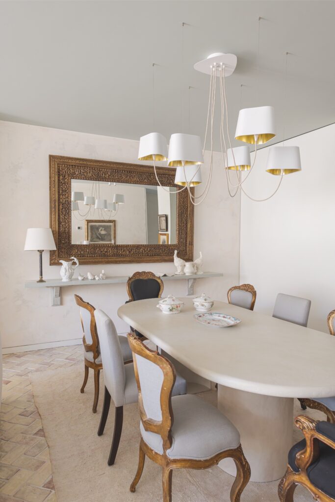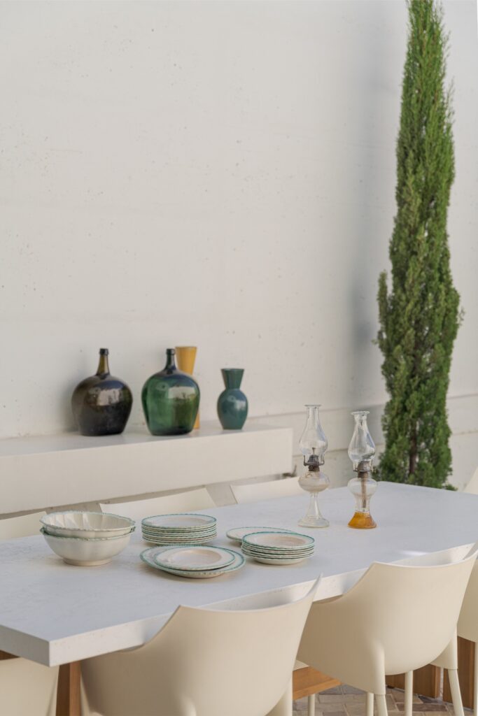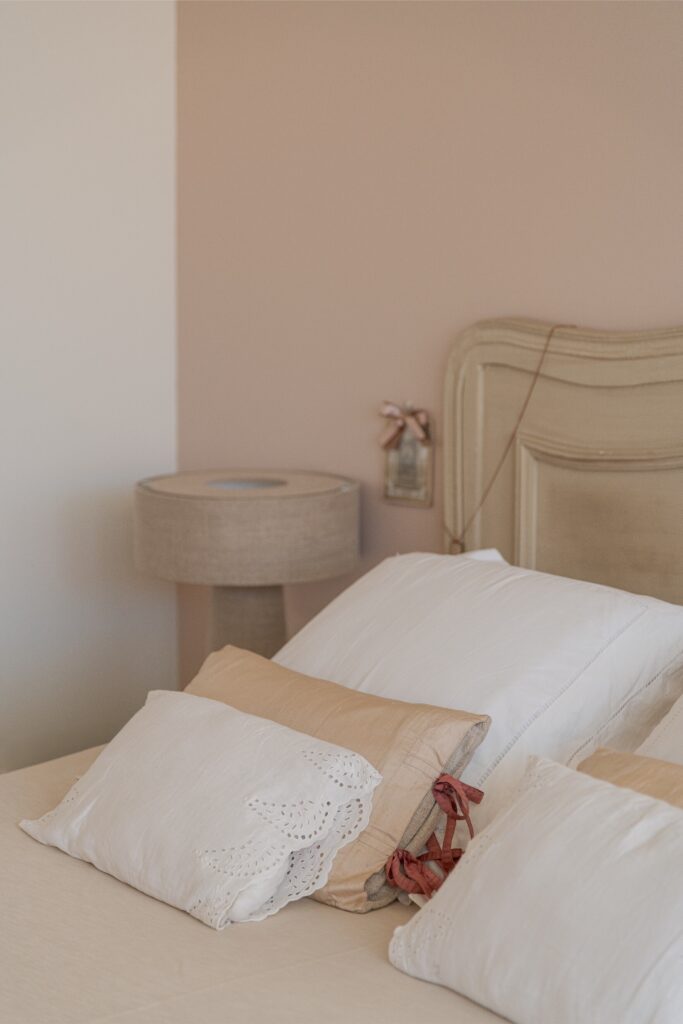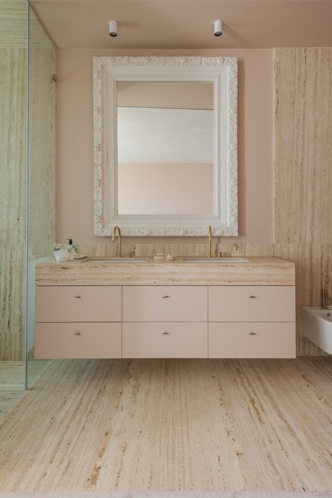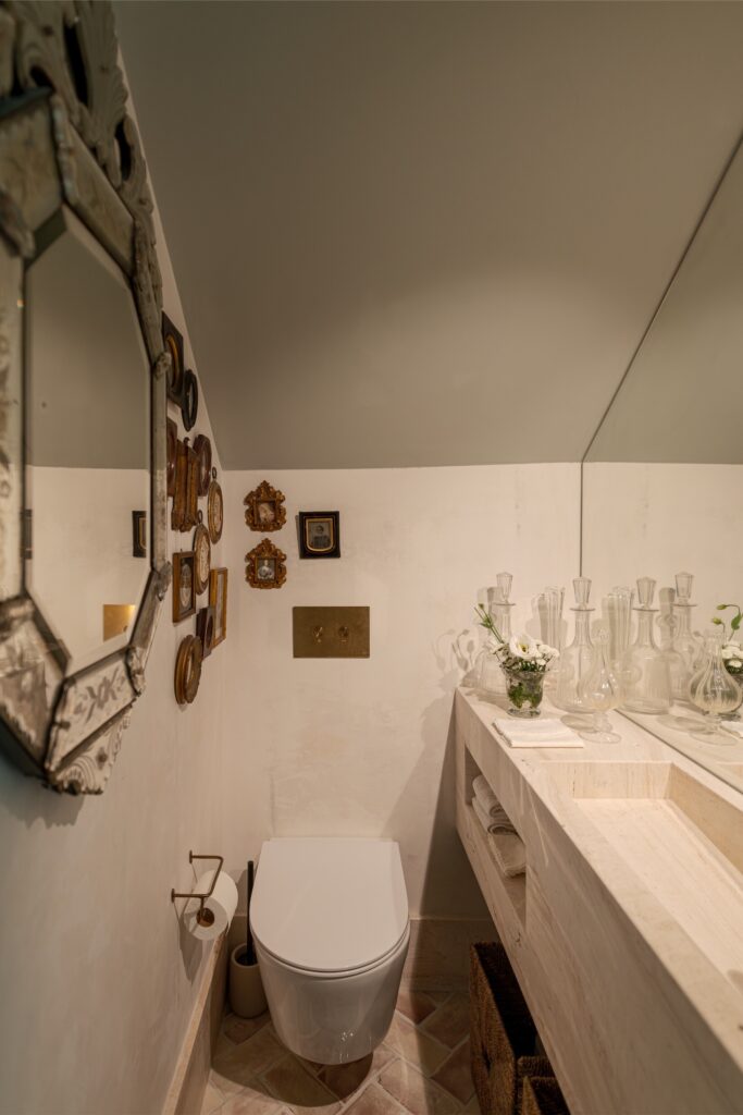 Os acabamentos revelam o cuidado em cada detalhe: o chão em tijoleira manual vidrada, em tom de manteiga, prolonga-se até ao jardim, e as casas de banho revestidas a travertino — material preferido da dona da casa — conferem textura e luz.