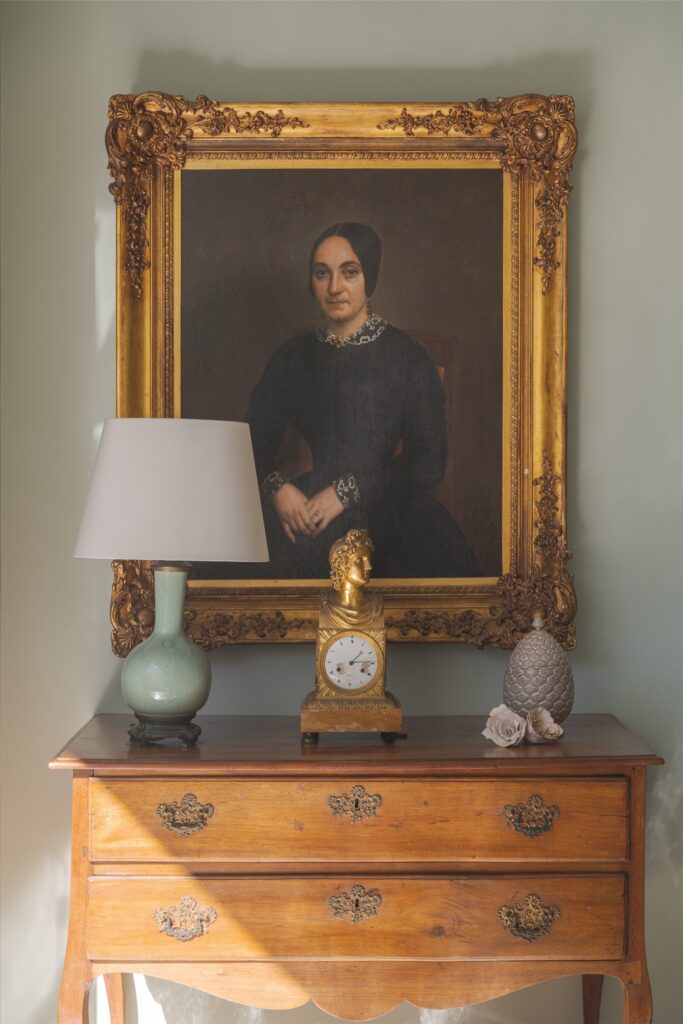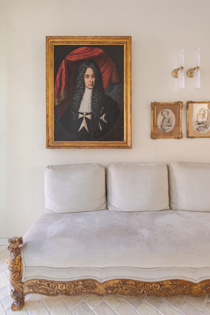 Os interiores, assinados também por Sá Aranha & Vasconcelos, respeitaram o caráter da casa e o gosto pessoal da proprietária, integrando móveis, quadros e esculturas de família. Na zona de estar, destacam-se os sofás, almofadas, mesa de centro e banquetas fornecidos pelo ateliê; na sala de jantar, a mesa e o candeeiro de teto acrescentam sofisticação. As cadeiras, peças de família do século XVIII, assim como o canapé da entrada, sobre o qual está um quadro de herança de família que retrata D. António Manuel de Vilhena (1663-1736), que foi o 66.º Grão-Mestre Soberano da Ordem de Malta  reforça essa harmonia entre o moderno e o antigo.