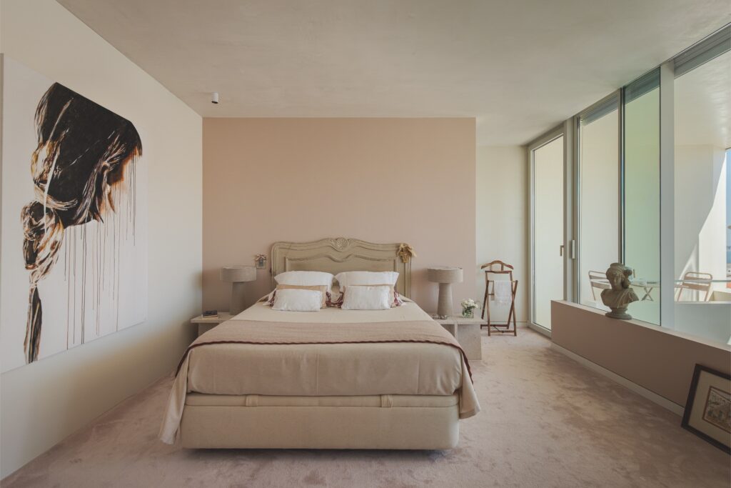“Tenho três filhas e cinco netas — esta é uma casa vivida com alegria”, conta-nos Bébé Mesquitella, proprietária da casa. E foi justamente essa energia que deu forma ao projeto de arquitetura, pensado para acolher e partilhar. No primeiro piso, duas suítes — a principal e a de visitas — garantem conforto e privacidade, mantendo o mesmo fio condutor estético: a elegância natural dos materiais e a harmonia das cores.