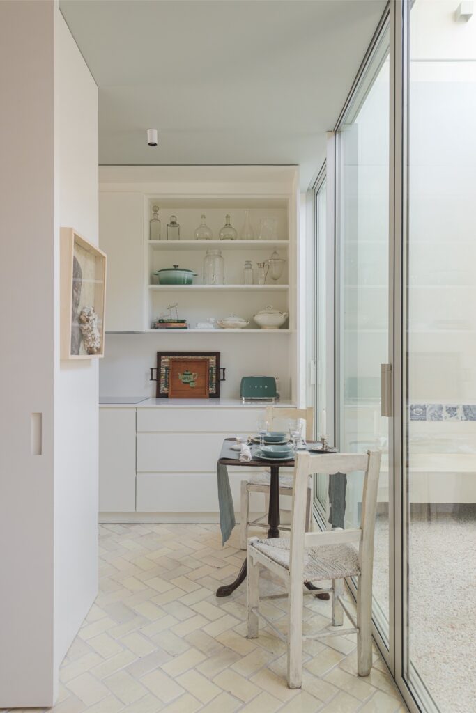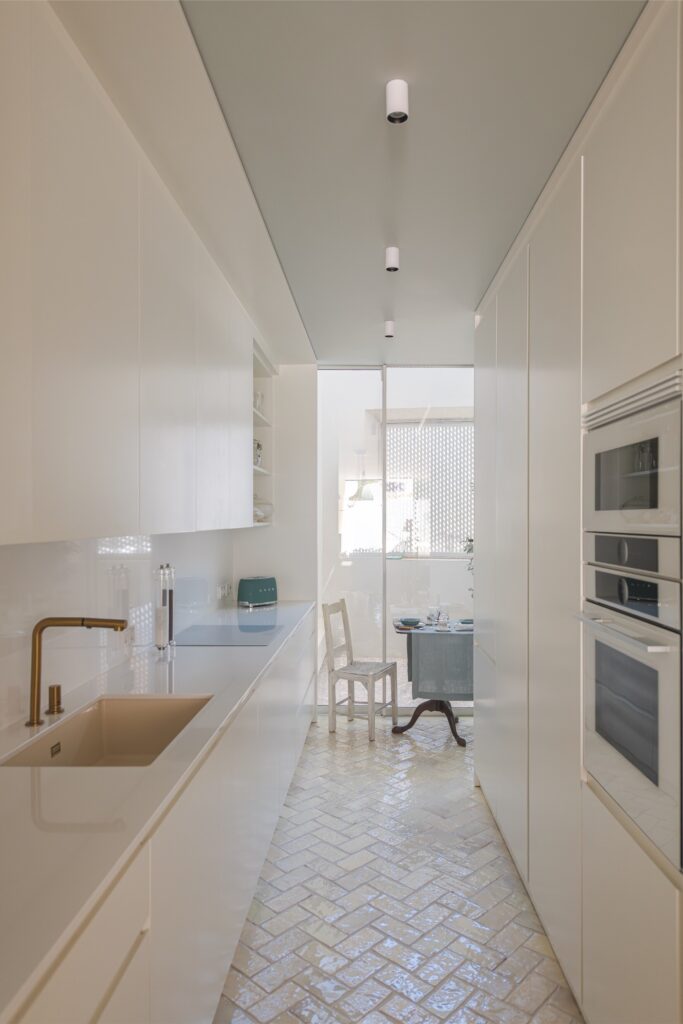 Na fachada, o tom azul-esverdeado evoca a cor original e o passado fabril da zona. A entrada, feita por meio de um portão de madeira que se abre para um pátio empedrado, revela uma fachada envidraçada que permite que a luz percorra o interior. Entre o passado fabril de Marvila e a modernidade discreta do projeto, esta é uma casa que, no fundo, tem uma alma lisboeta — um lugar onde o tempo abranda, feito de afeto e elegância.