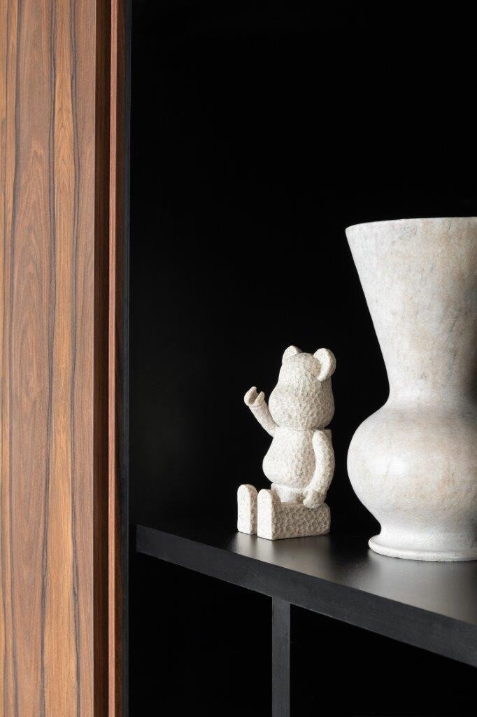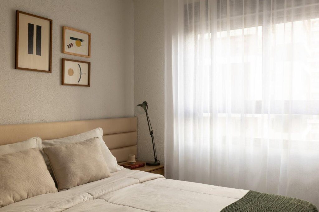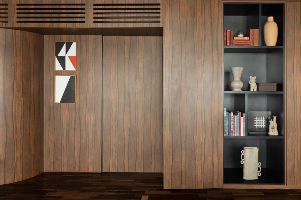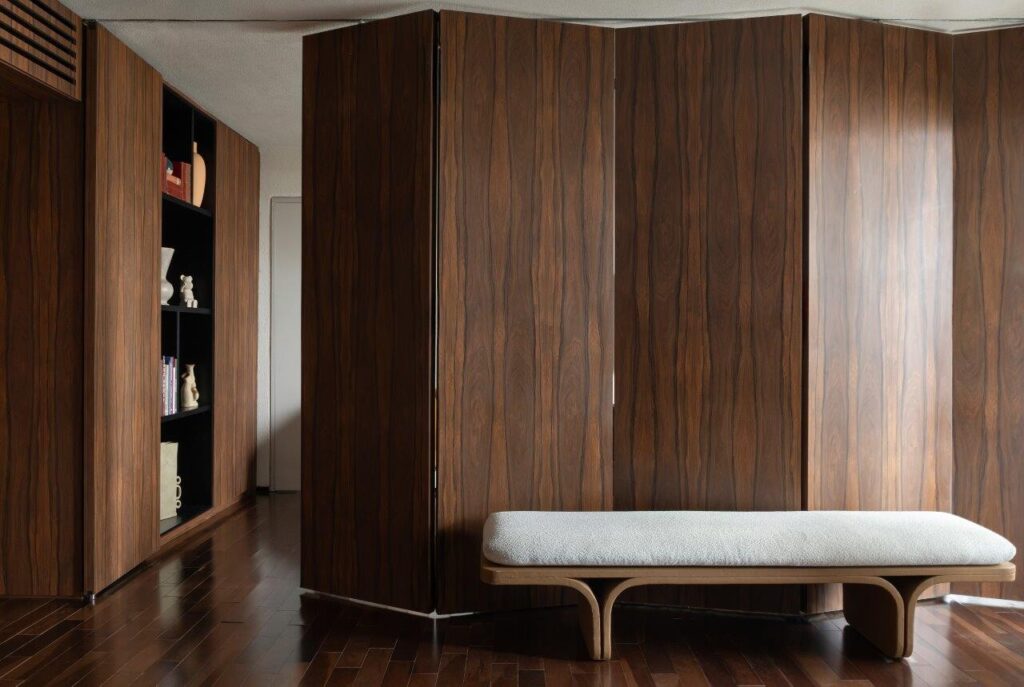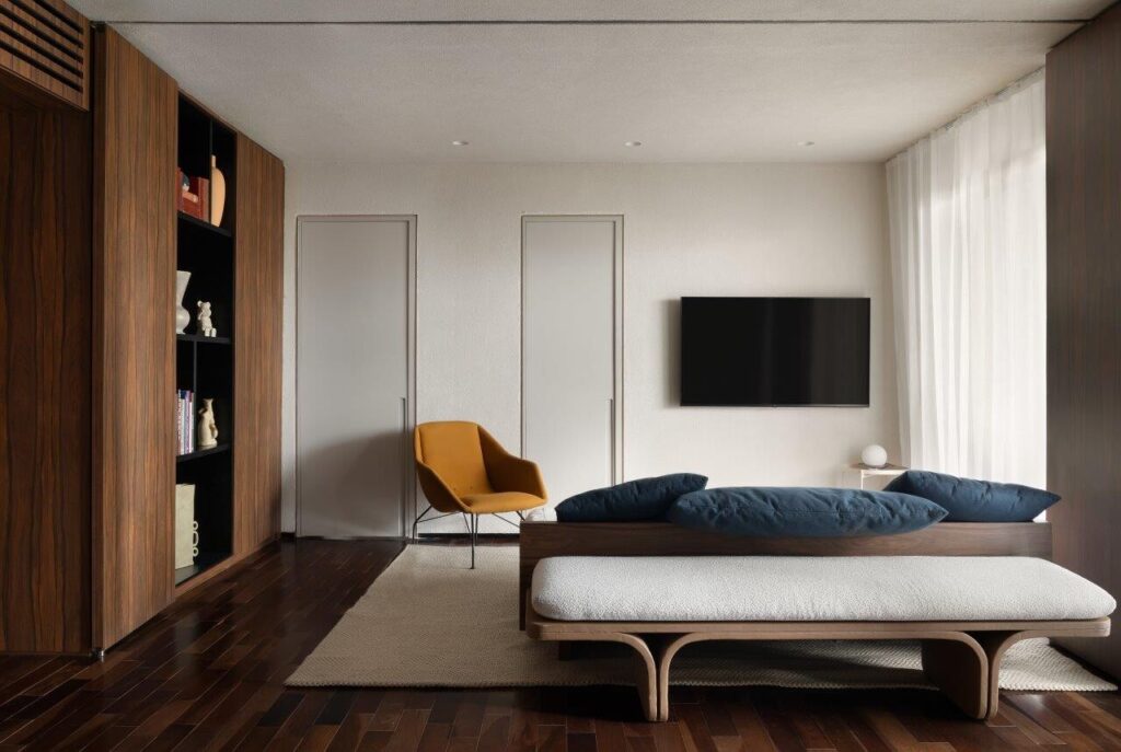 A remodelação redefiniu por completo a distribuição original do imóvel. Um dos quartos foi eliminado para dar lugar a um outro itinerante – uma solução inovadora que permite adaptar o espaço consoante as necessidades do momento. Este ambiente pode integrar-se na área social ou funcionar de forma independente, graças a um sistema de painéis e portas em marcenaria, que se afirmam como um dos elementos-chave do projecto — tanto do ponto de vista funcional como estético.