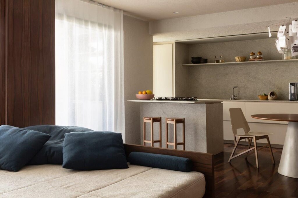 Com 86 m², este apartamento no bairro do Brooklin, em São Paulo, foi transformado numa residência de apoio pensada para um proprietário jovem, solteiro e com uma rotina urbana dinâmica. Concluído em janeiro de 2024, o projecto assinado por José Navarro e Ana Carolina Walker aposta numa linguagem contemporânea, funcional e acolhedora, onde a flexibilidade do layout se assume como fio condutor.