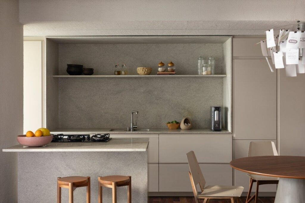 A paleta cromática combina tons de cinzento com nuances quentes de madeira. Os materiais e revestimentos foram escolhidos com base em critérios de funcionalidade, conforto e intemporalidade, resultando numa atmosfera equilibrada, elegante e duradoura. A marcenaria destaca-se como protagonista tanto na organização do espaço quanto na valorização visual dos interiores.