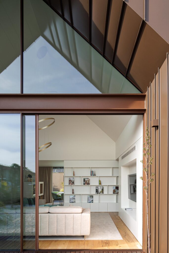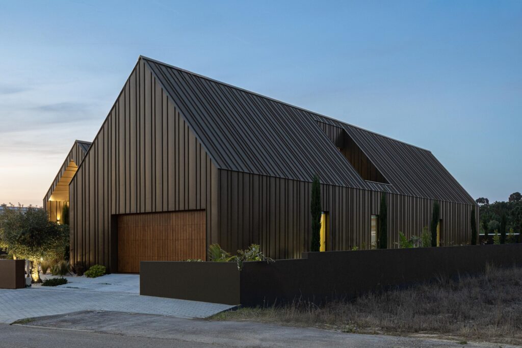 Desenvolvida num único piso, a casa organiza-se em dois volumes triangulares revestidos a zinco castanho que reinterpretam a arquitetura vernacular da região, articulando pátio, luz e aberturas estratégicas para criar uma relação fluida, luminosa e contemporânea entre interior e paisagem.