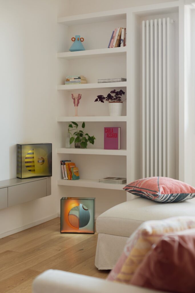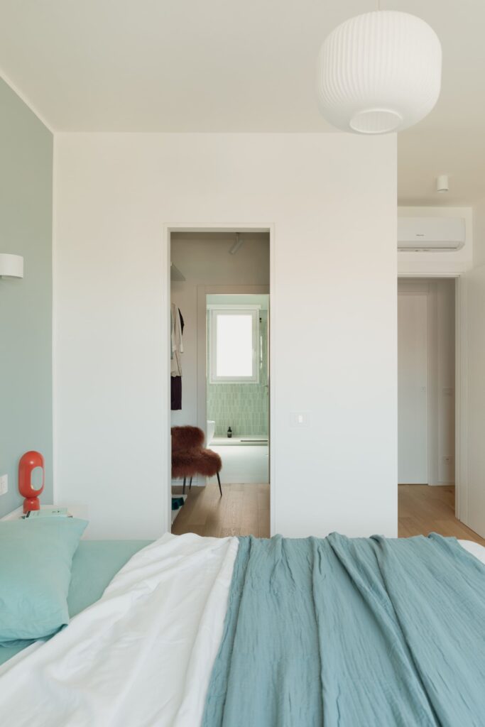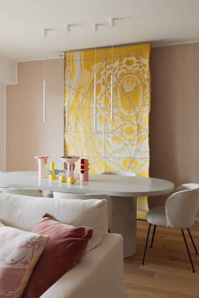 A narrativa cromática expressa-se também nos detalhes de mobiliário, que combinam influências orientais e maximalismo americano, equilibrados por peças criadas por designers romanos: os painéis de chinoiserie pintados à mão pela Officine Adda, a tapeçaria Zolfo Borromini produzida pela Torrilana e desenhada por Effimero Barocco, as cerâmicas coloridas de Ari De Luca, o espelho Murales e as vitrinas em vidro de Giovanni Botticelli, e a iluminação poética de Barbara Andreotti. Cada elemento contribui para um conjunto coerente, onde a funcionalidade do design de interiores se funde com a leveza de um quotidiano íntimo e luminoso.