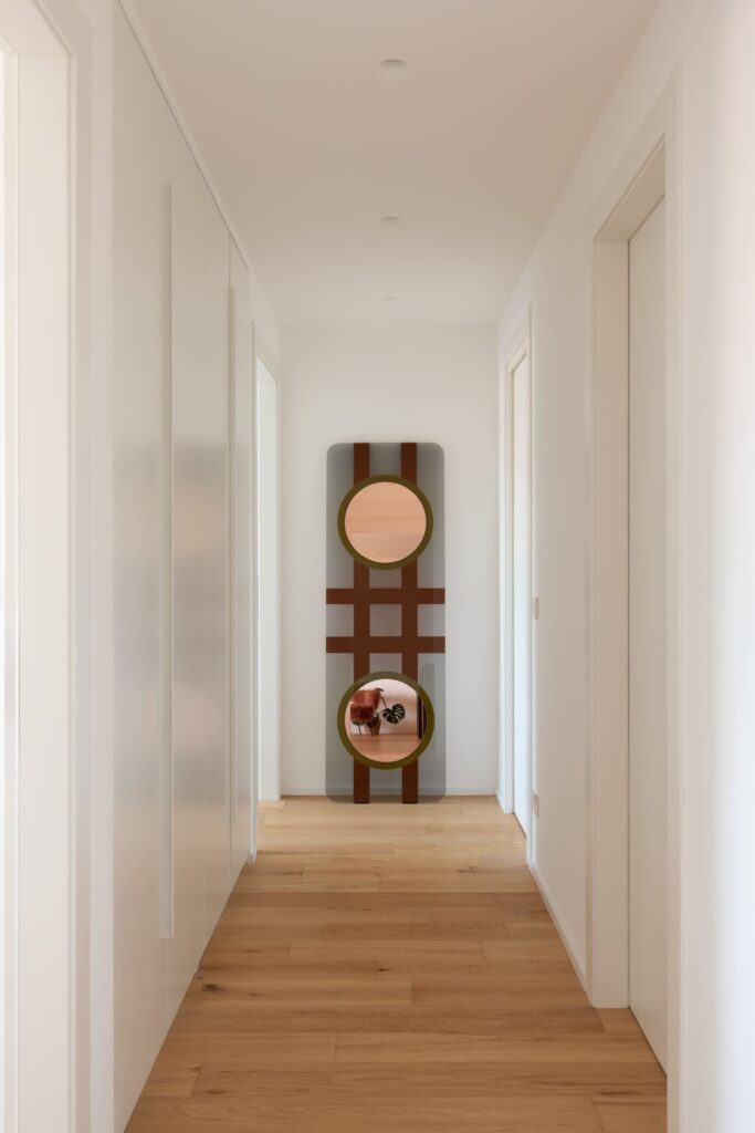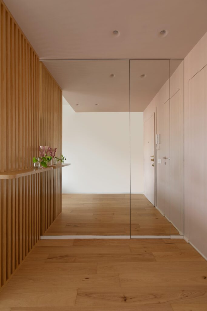 A entrada, totalmente redesenhada, caracteriza-se por uma parede ripada em carvalho e por um grande espelho do chão ao tecto, atrás do qual foi integrado um roupeiro. É o primeiro gesto arquitetónico que introduz a linguagem material e cromática de todo o projecto.