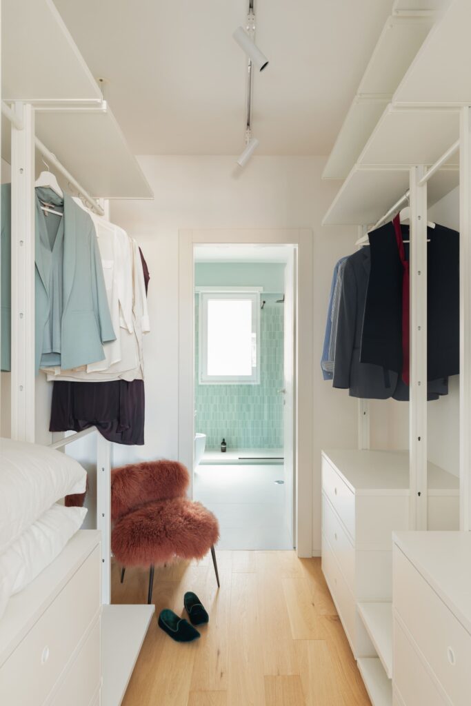 A casa, com 120 metros quadrados — originalmente em bom estado, mas datada na organização espacial e nos acabamentos — foi alvo de uma renovação destinada a devolver funcionalidade e leveza aos espaços. A nova configuração inclui uma suite com closet e casa de banho privativa, um segundo quarto, uma casa de banho com zona de lavandaria integrada e novos espaços de arrumação distribuídos entre a entrada e o corredor. O projeto assenta numa ideia de equilíbrio funcional e continuidade visual, em que mobiliário desenhado à medida e marcenaria personalizada definem as funções domésticas com sobriedade e precisão.