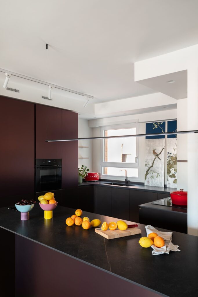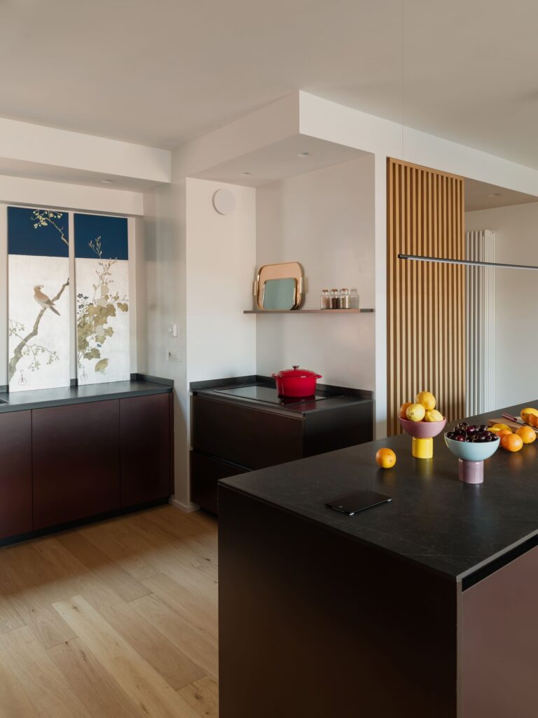 “Quis sintonizar-me não apenas com as necessidades pragmáticas dos dois clientes”, explica Raffaella Falbo, “mas também com aquelas que têm uma ressonância emocional. Por exemplo, na cozinha, a ilha de grandes dimensões não é apenas um elemento funcional; acima de tudo, evoca memórias da ampla cozinha familiar nos Estados Unidos. Do mesmo modo, a paixão pelo Oriente reflecte-se na chinoiserie pintada à mão — uma referência que remete não só para a estética, mas também para a preciosidade de certos elementos decorativos tradicionais chineses.”