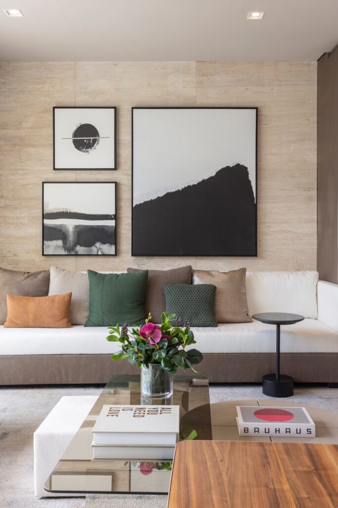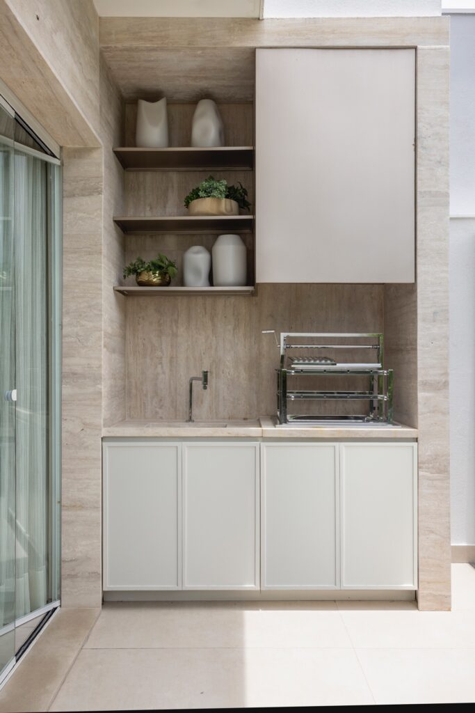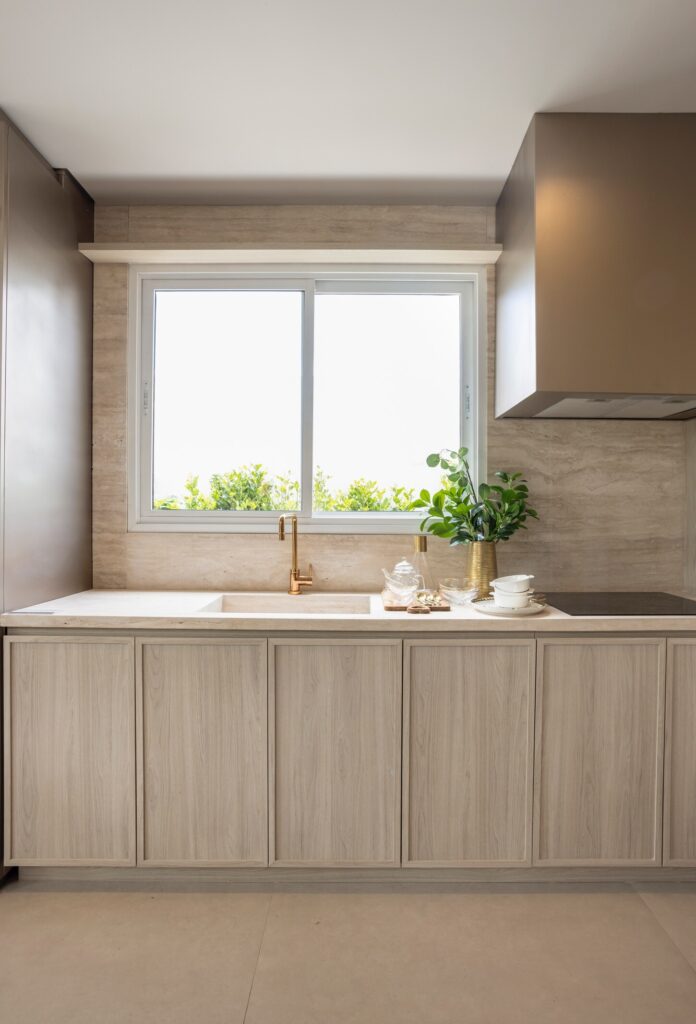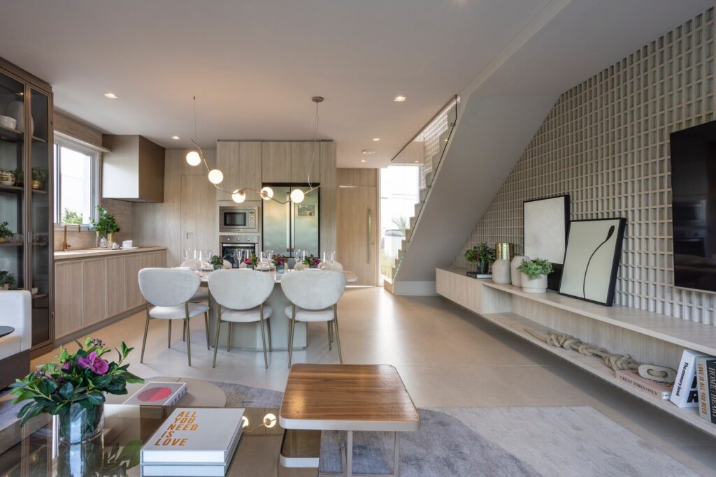 Com interiores assinados por Paula Aveiro Arquitetos, a Casa Muxarabi apresenta uma arquitetura que investiga a relação entre interior e exterior a partir de luz, texturas e fluidez espacial. O projeto explora uma combinação de elementos naturais – madeira clara, travertino navona e tonalidades de areia – para construir uma atmosfera acolhedora, concebida para uma família que gosta de receber, compartilhar e habitar espaços integrados.