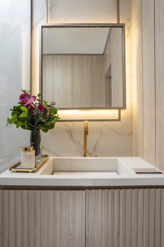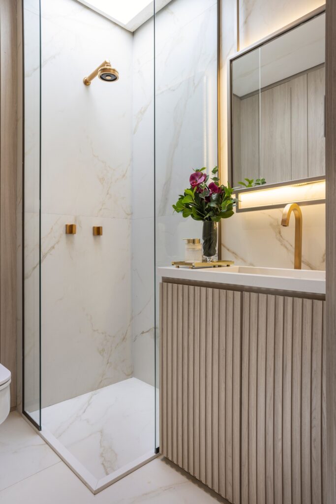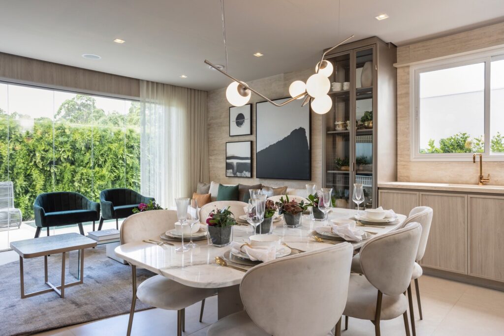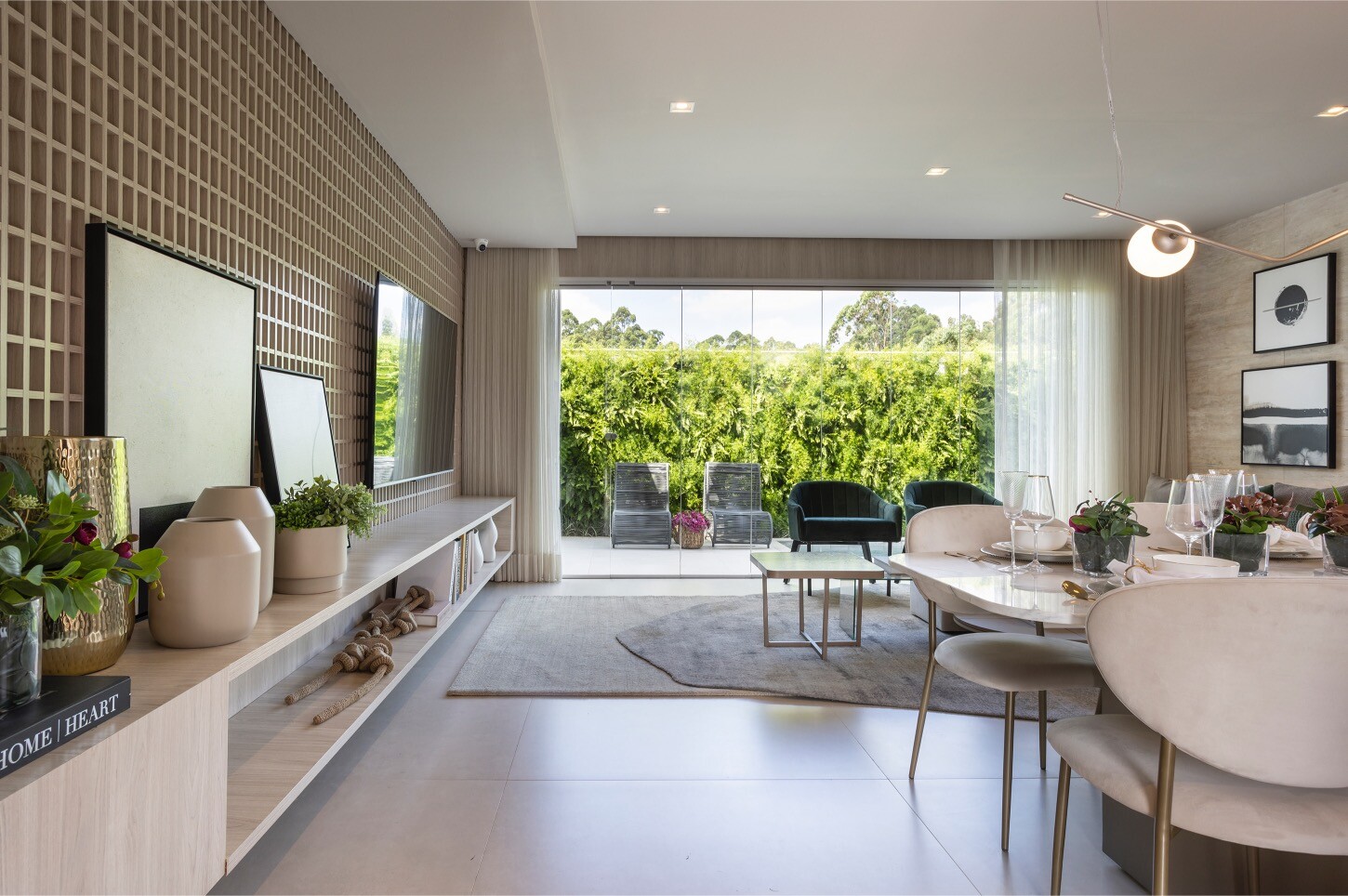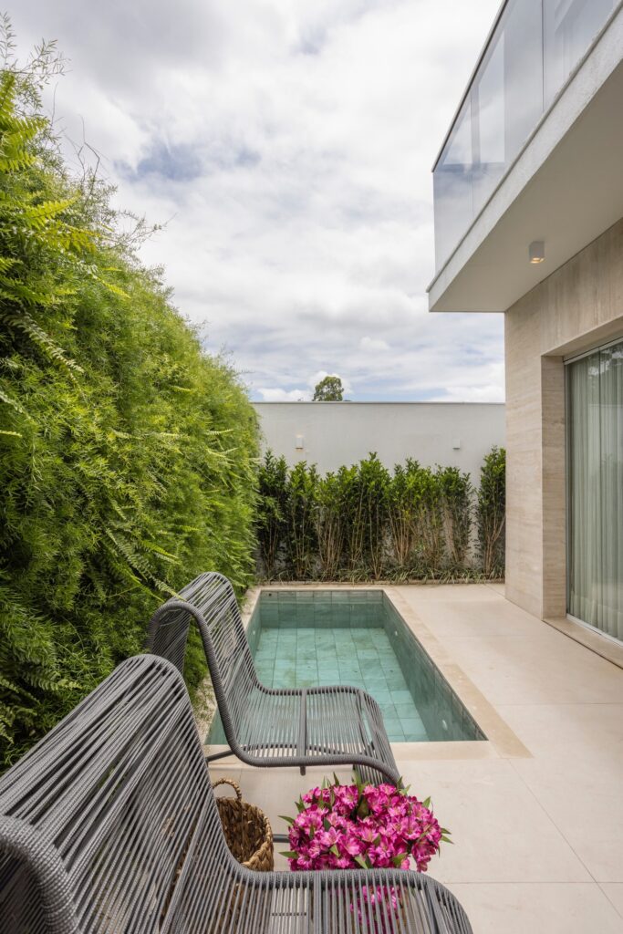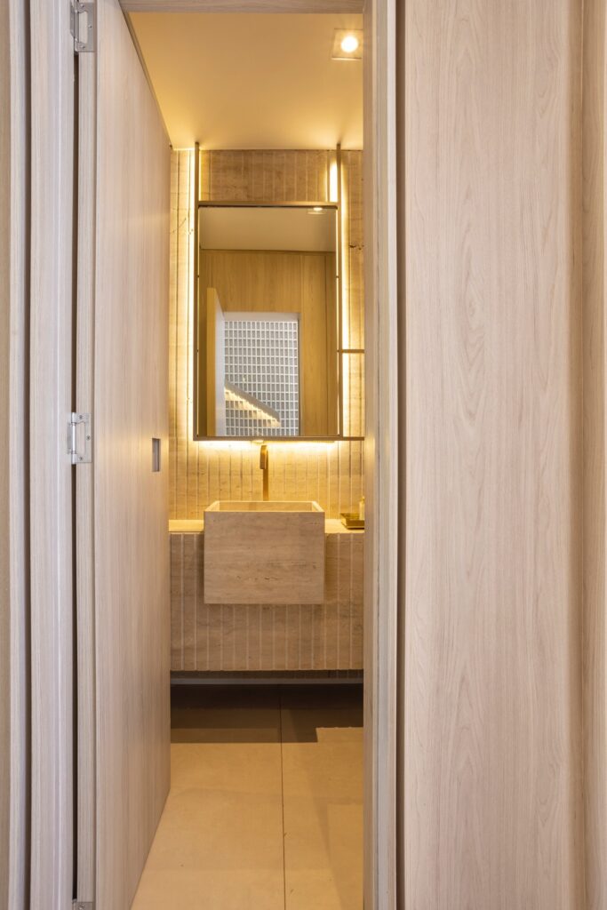 O eixo conceptual da casa é o painel muxarabi que percorre o hall, escada e zona social, atuando como identidade e elemento de continuidade visual entre os dois pisos. No andar térreo, cozinha e sala de jantar estão integradas. Portas mimetizadas e vidro estruturado que valoriza a escada como peça escultórica, além das marcenarias claras e dos revestimentos contínuos, contribuem para uma leitura limpa e fluida dos ambientes, criando uma arquitetura discreta, mas visualmente impactante.