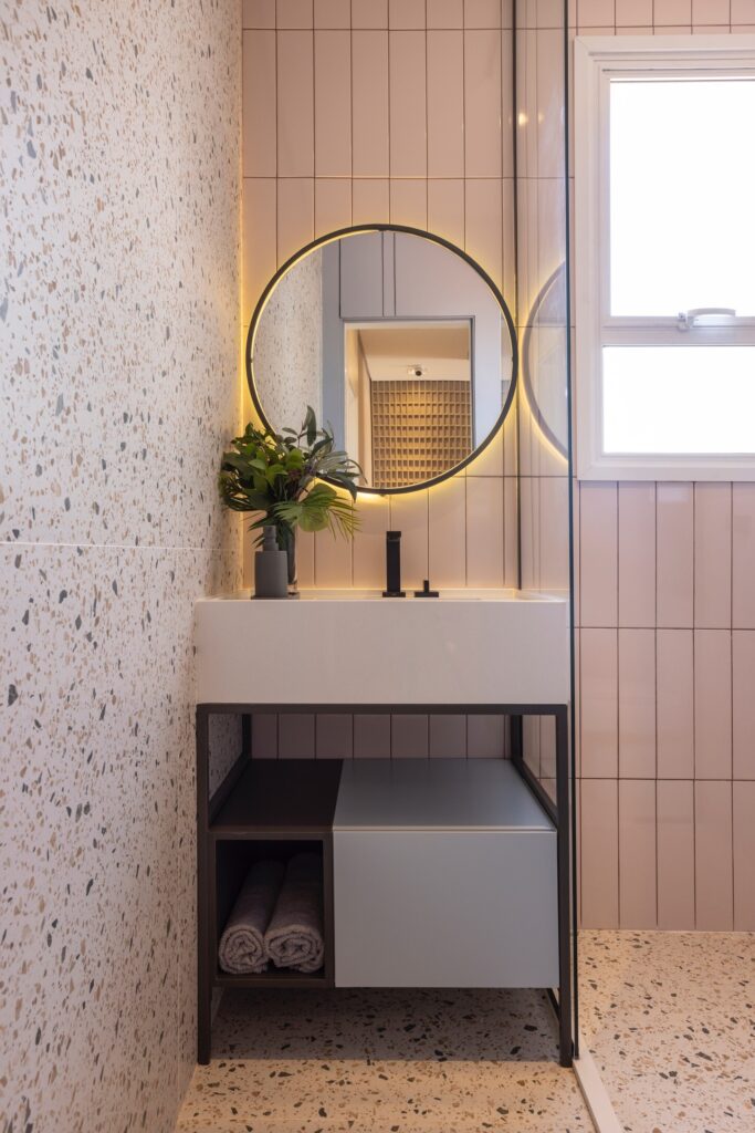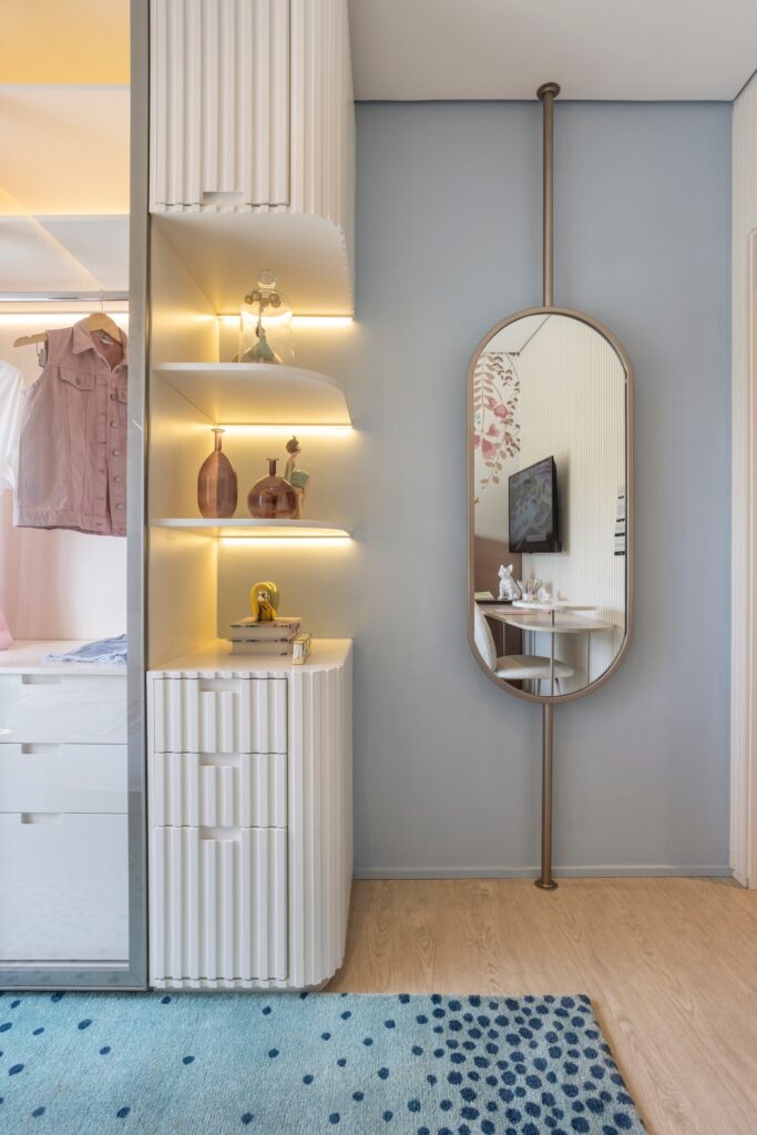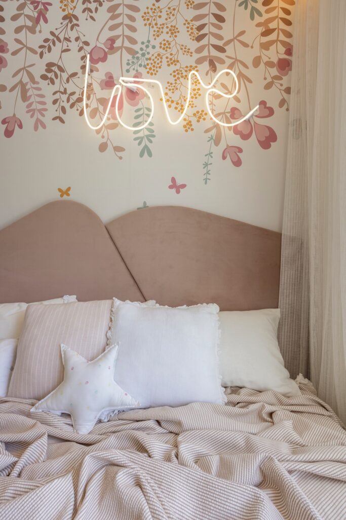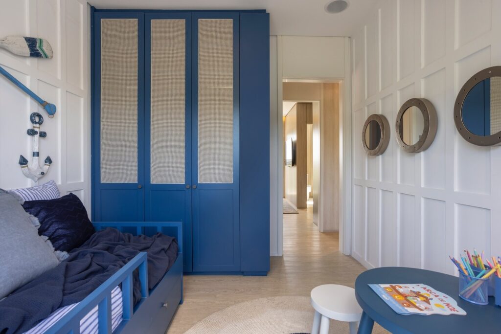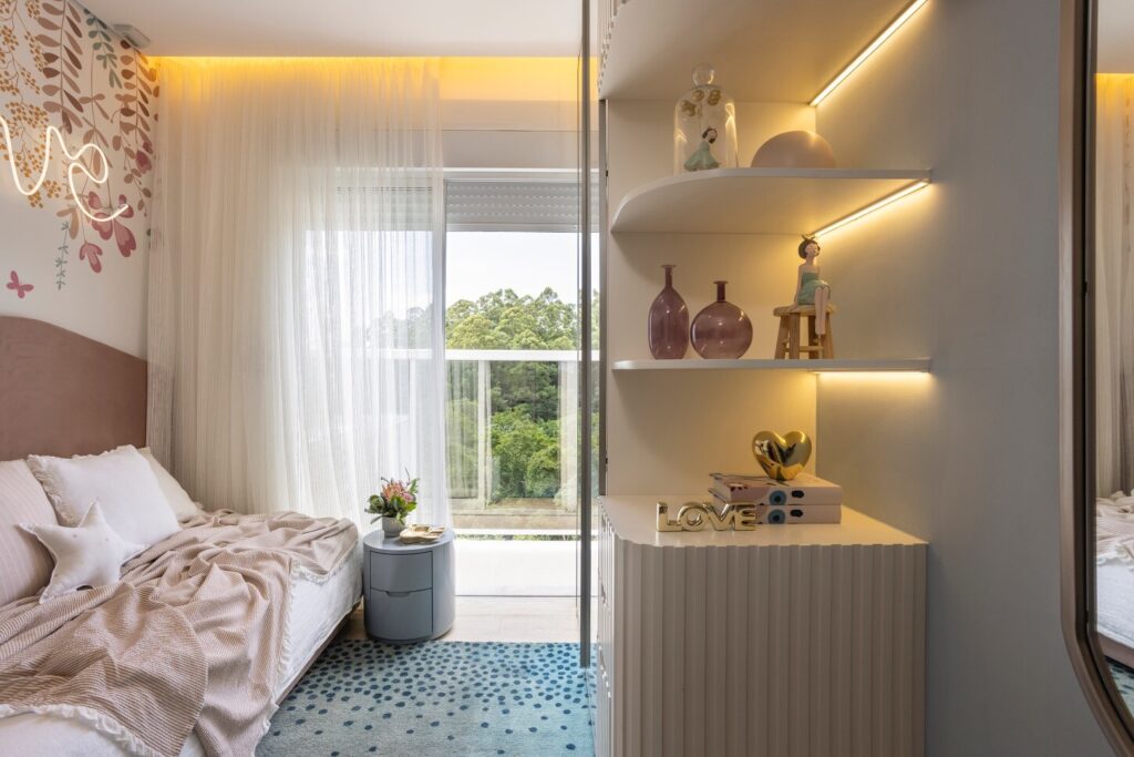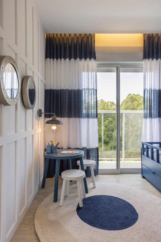 No piso superior, cada quarto recebeu uma atmosfera própria. O quarto da menina foi projetado com uma paleta suave de verdes, azuis e tons quentes, inspirada no frescor e na tranquilidade de um jardim, criando um ambiente acolhedor e sereno. Já o quarto do menino adota referências náuticas e dá prioridade à área central livre para brincar e imaginar, mantendo o vínculo com o terraço. O lavabo compartilhado equilibra rosa e azul com pavimento em granilite, criando uma linguagem jovem.