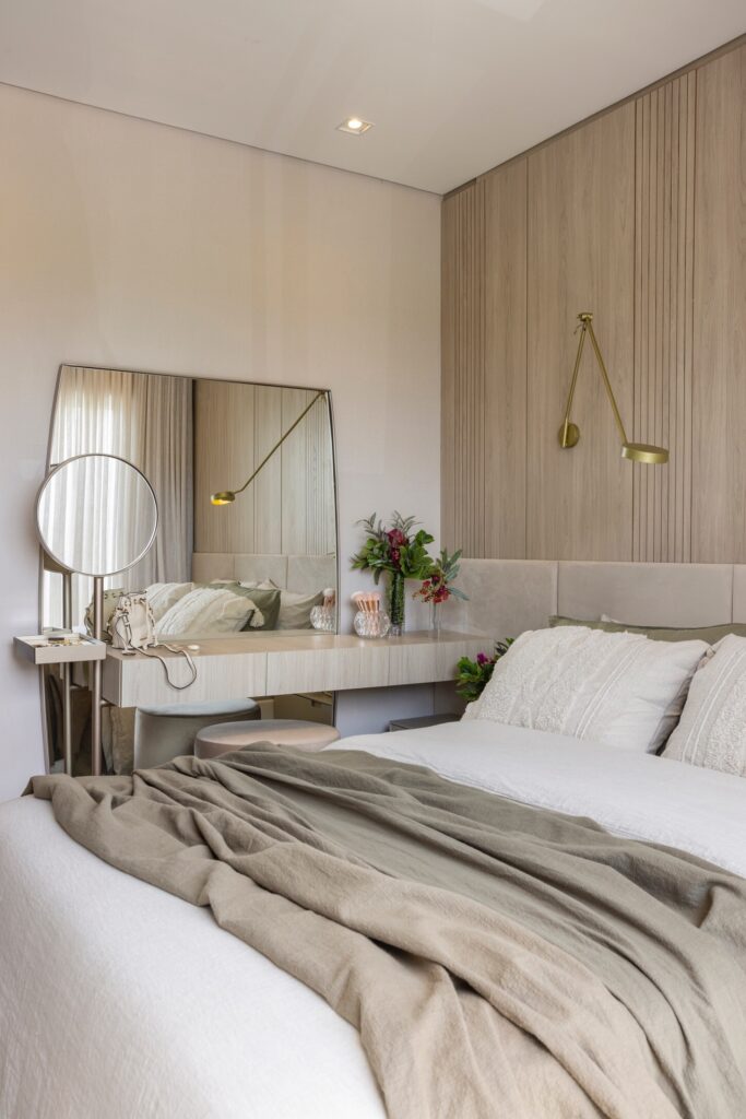 A suíte do casal retoma a paleta natural do projeto com linho, madeira clara e papel de parede que amplia a sensação de aconchego. O quarto de banho, revestido integralmente e iluminado por claraboia, oferece uma experiência sensorial marcada pela entrada de luz natural.