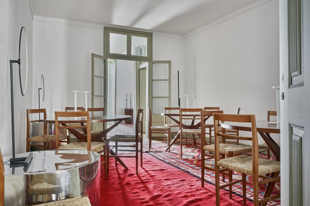 O mobiliário assume um papel central na narrativa do espaço. Entre peças icónicas de vários autores, destaca-se a escolha do conjunto da Linha BNU — mesa e cadeira superligeira — concebido pelo ateliê Daciano da Costa. Criada em 1963, a Linha BNU foi originalmente desenhada para equipar as casas dos funcionários do Banco Nacional Ultramarino em regiões com recursos limitados, tanto no interior de Portugal como nas então colónias.