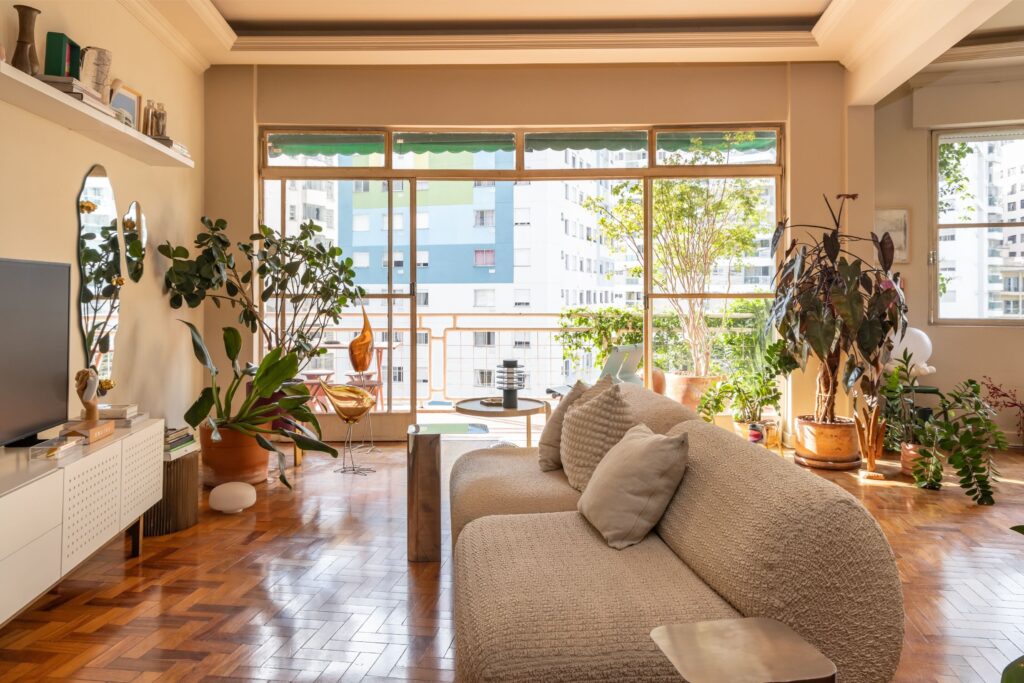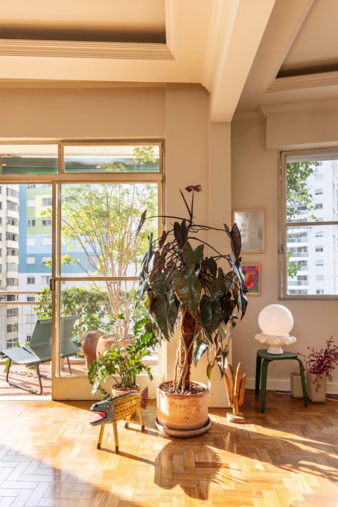 Cinco anos depois da mudança, sentiram que era tempo de registar o resultado. As fotografias de Evelyn Müller captam não apenas um apartamento no centro de São Paulo, mas a sedimentação de um processo partilhado. Imperfeito no início, paciente na construção, profundamente vivido. Uma casa que não procura impressionar — mas que, precisamente por isso, inspira.