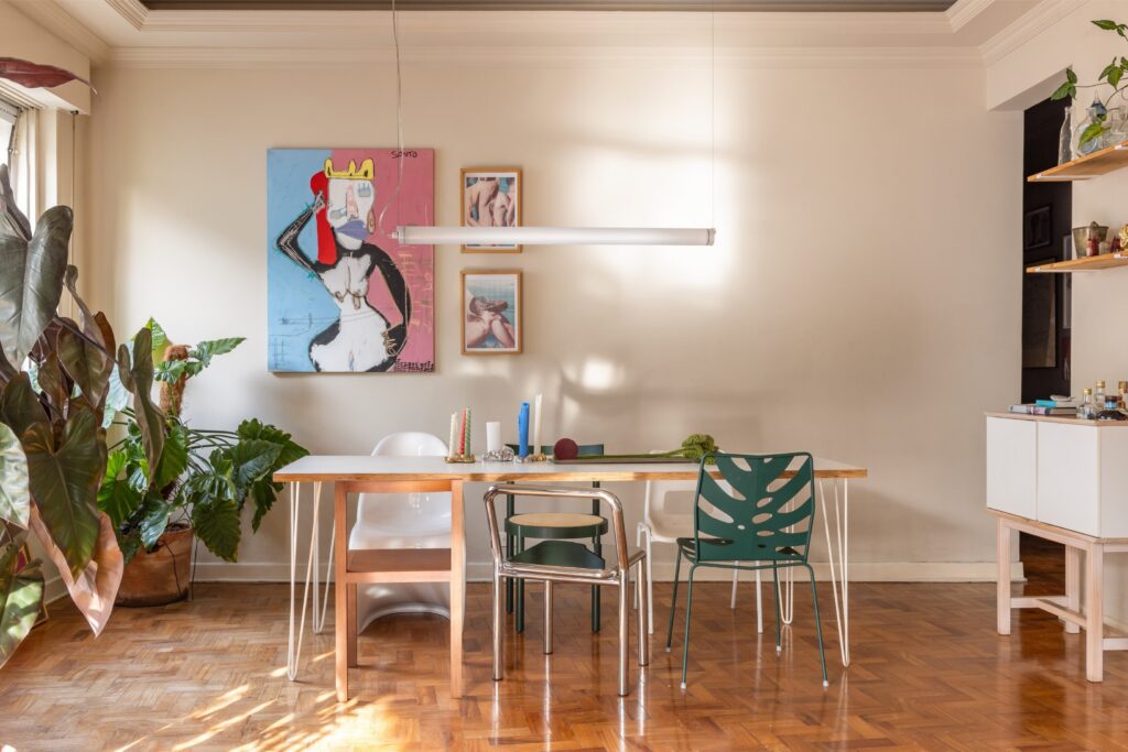 Ao lado destes ícones, peças de novos estúdios e designers brasileiros reforçam o carácter contemporâneo do conjunto: cadeiras da Forma Bruta, espelhos do Estúdio Geo, mesas laterais da Bravios Estúdio, pássaros da Lott + Tomaz, entre outros. A arte ocupa paredes e circulação, numa galeria afectiva que reúne amigos e criadores como Santo — autor dos desenhos na cabeceira do quarto, onde Pablo é representado como “Caos” e André como “Rei Sol” —, Bia Braz e vários outros nomes da cena artística local.