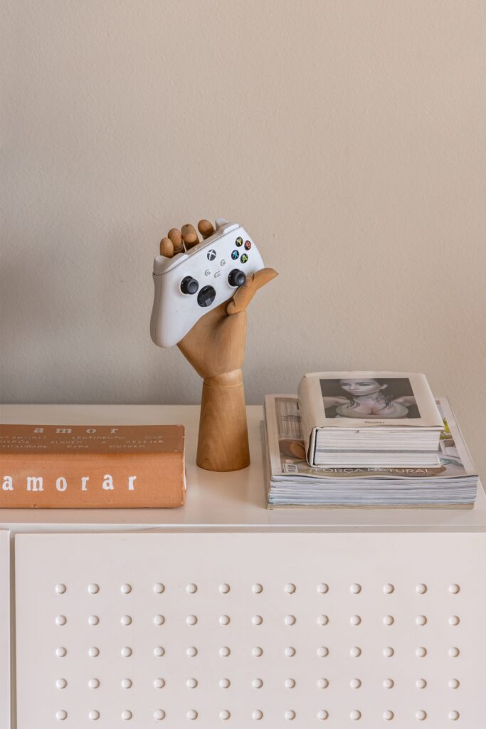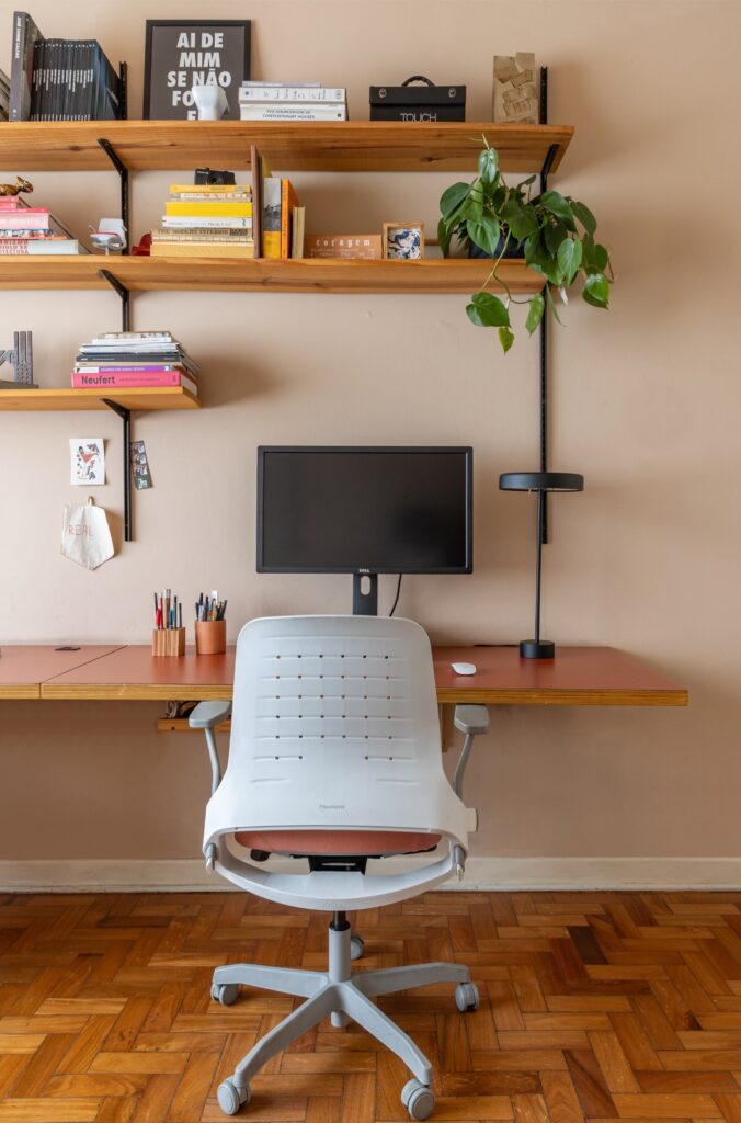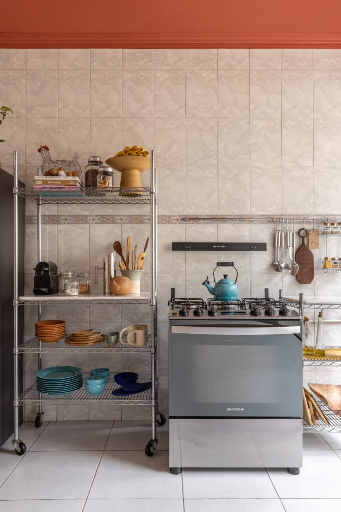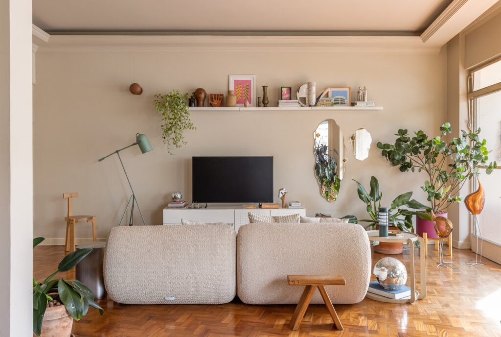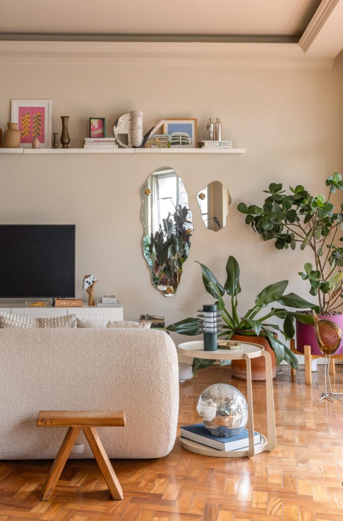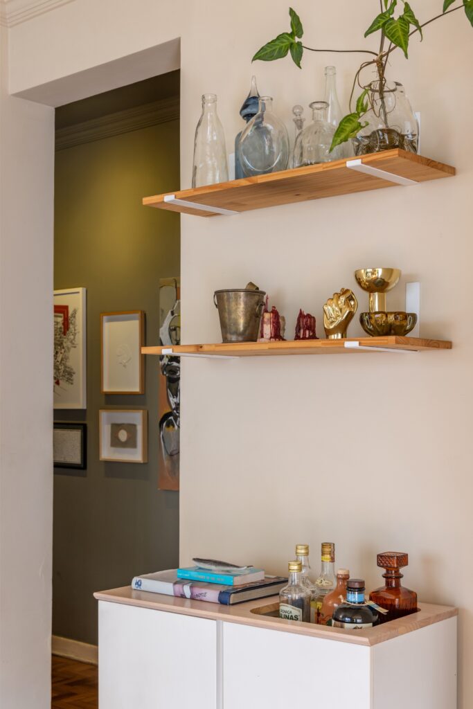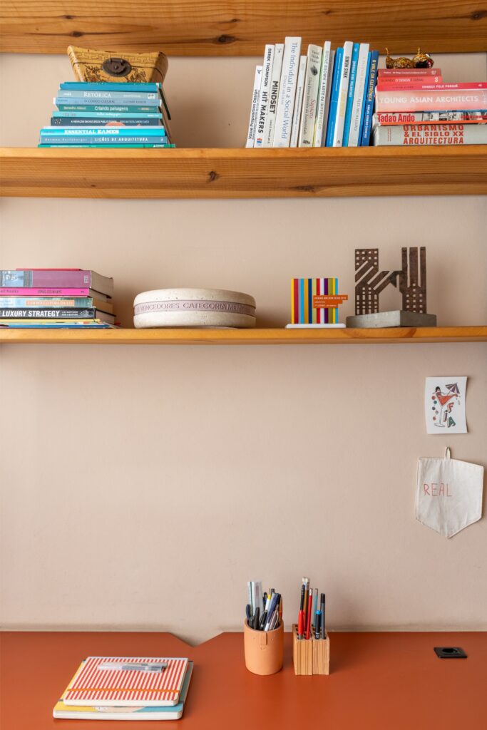 Não há um estilo fechado. O apartamento constrói-se como uma colagem viva: peças de design convivem com achados do OLX, memórias de viagem, fantasias de Carnaval e livros de psicanálise. A narrativa é afetiva, não programática.