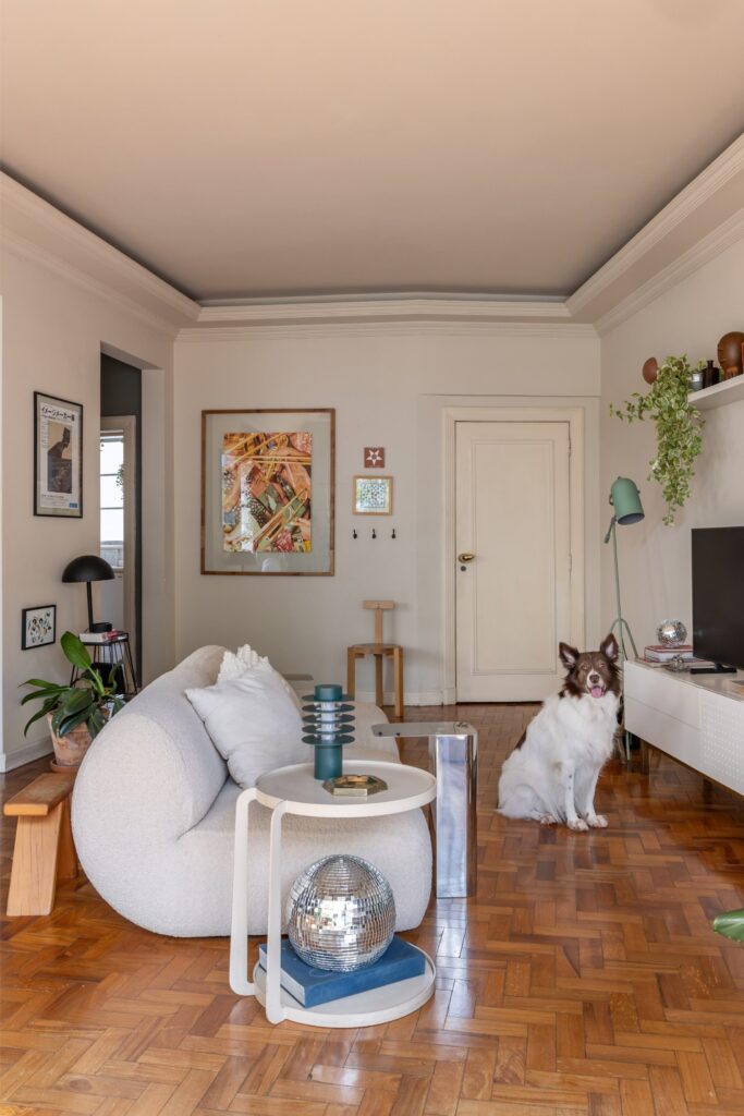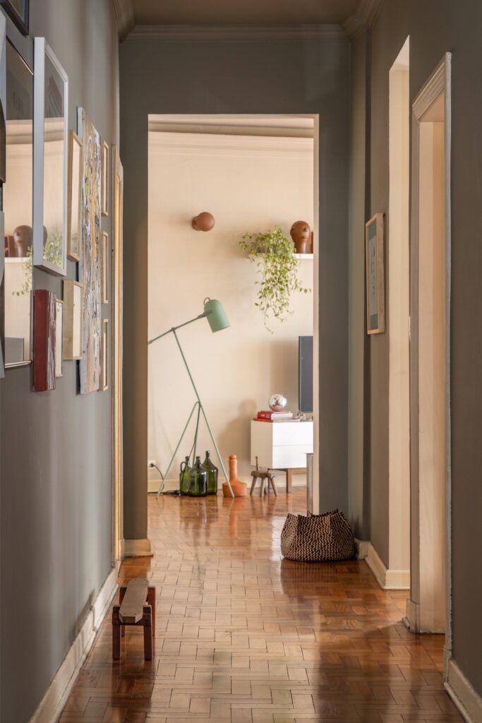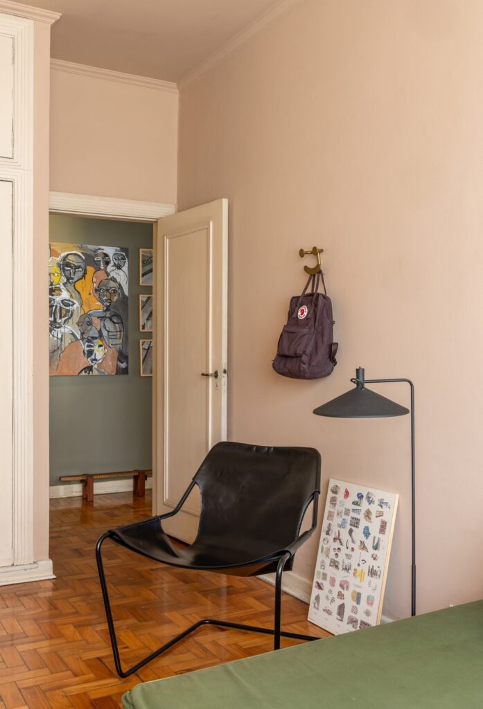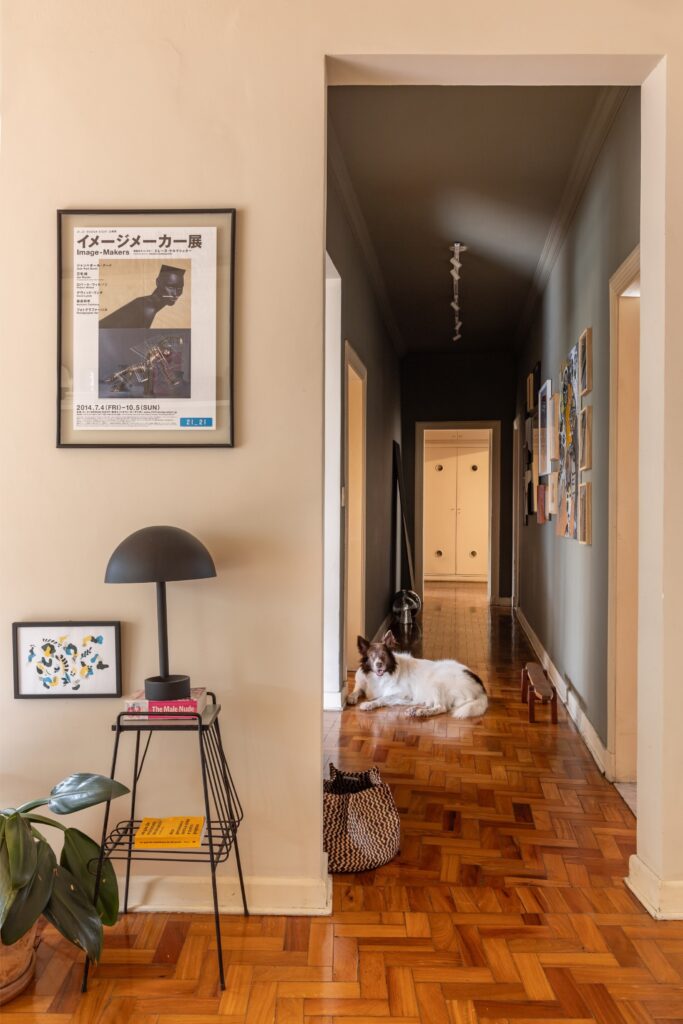 Encontraram este apartamento fechado há quase dois anos. Havia infiltrações, bolor, tetos a descascar. Mas o soalho de taco em peroba-rosa, o pé-direito generoso e a planta ampla compensavam todas as imperfeições. Durante três meses resolveram problemas hidráulicos; ao longo de mais de um ano pintaram, divisão a divisão, ao ritmo do tempo e do orçamento. Não houve alterações estruturais — adaptaram-se ao layout herdado das transformações feitas nos anos 90, que uniram quartos e abriram a sala de jantar.