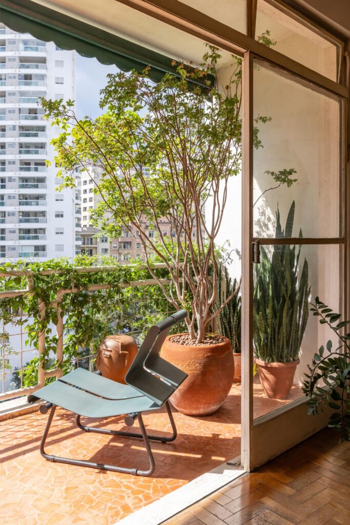 Na varanda curva, o caquinho cerâmico substituiu o antigo pavimento excessivamente reflectivo, evocando as varandas de casas antigas e tornando o espaço mais habitável. Entre plantas — com destaque para a jabuticabeira que raramente chega a dar frutos antes dos pássaros —, preserva-se também uma espada-de-são-jorge deixada pela antiga proprietária.