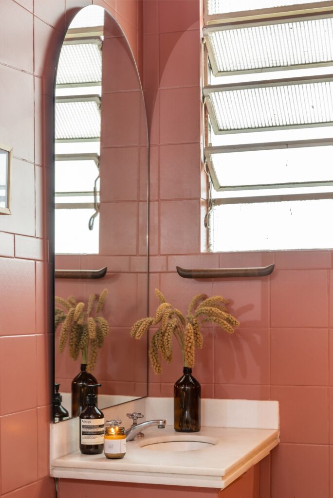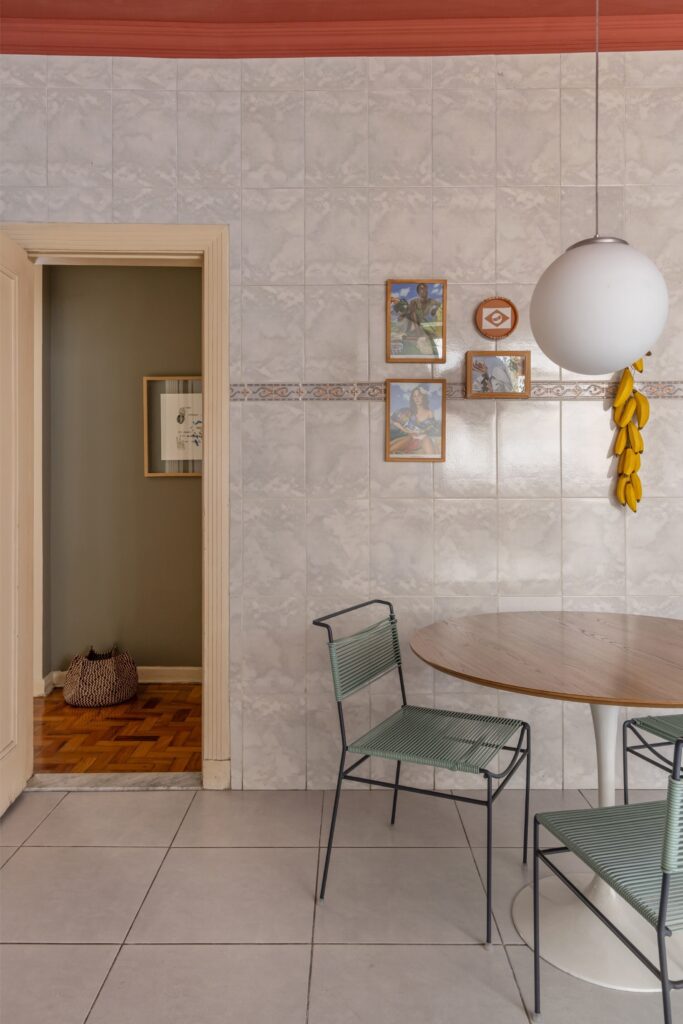 O corredor assume um verde militar que articula os ambientes. Na cozinha, o tecto em vermelho-escuro introduz calor e personalidade, equilibrando a luz natural e dialogando com armários claros e piso neutro. É o coração da casa e onde qualquer festa acaba inevitavelmente. A decisão de manter a cozinha fechada, com uma mesa redonda de quatro lugares, reforça essa atmosfera de refúgio.