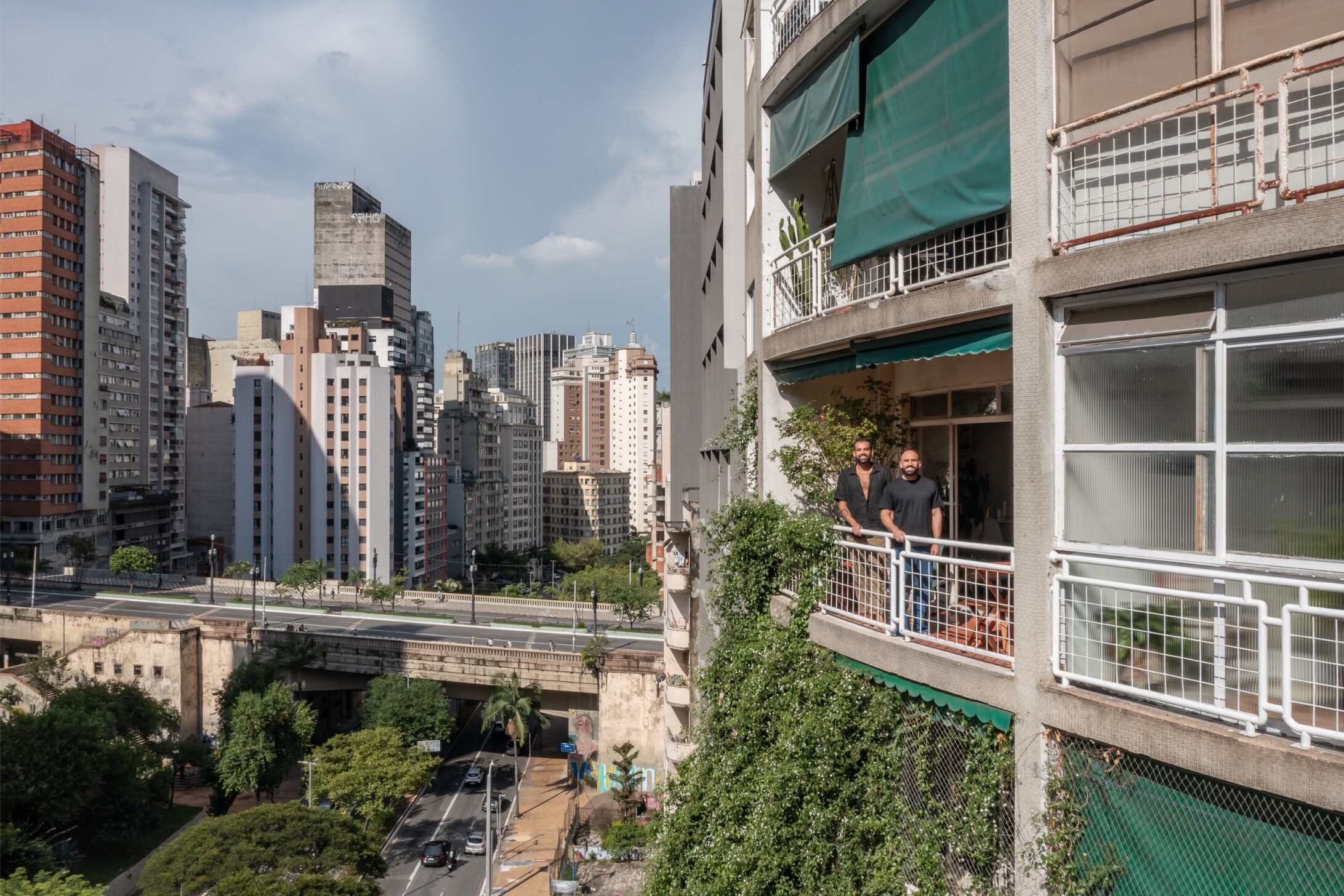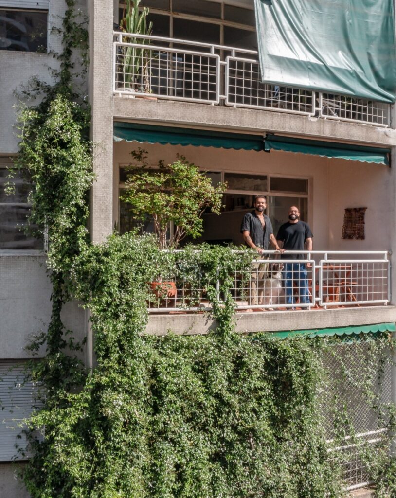 No centro de São Paulo, no Brasil, um edifício de 1953 desenha uma curva sobre as escadas que ligam à Avenida 9 de Julho. A fachada acompanha o movimento da esquina, com varandas arredondadas e uma trepadeira de jasmim-estrela que sobe até meio da construção, suavizando o betão aparente. É aqui, no Edifício Major Quedinho — cenário do filme Ainda Estou Aqui — que André Braz e Pablo Ladeira encontraram o lugar para construir casa.