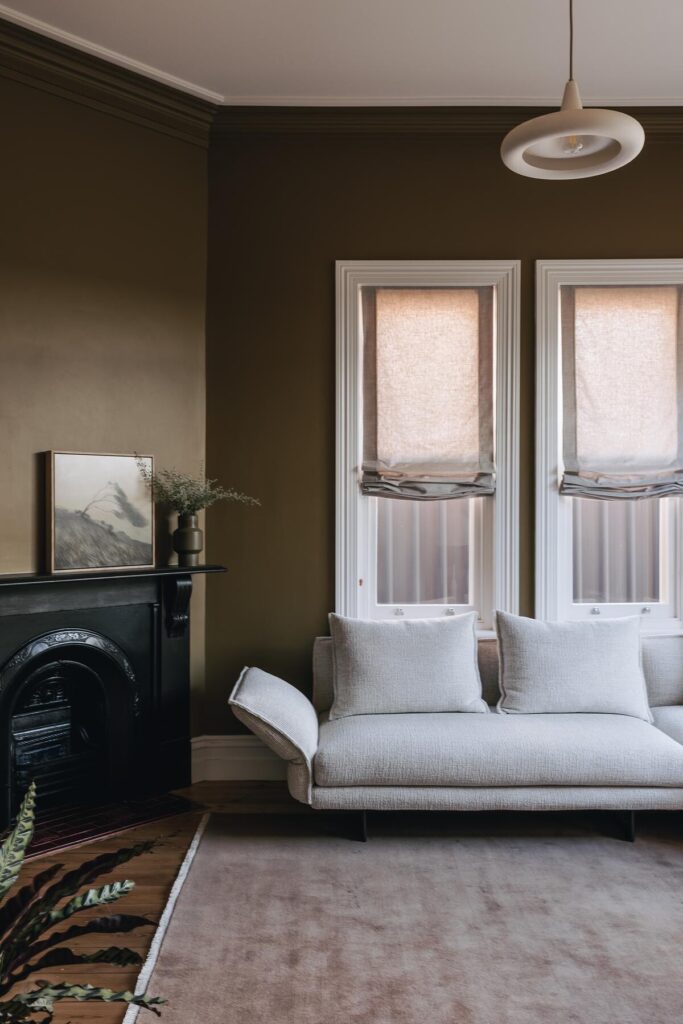 As divisões frontais foram cuidadosamente restauradas, com a reposição de lareiras, pavimentos em madeira e trabalhos em estuque. Em contraste, os novos espaços de estar abrem-se generosamente para o jardim orientado a norte e apresentam pavimentos em betão polido, amplas superfícies envidraçadas e uma paleta contida de materiais naturais.