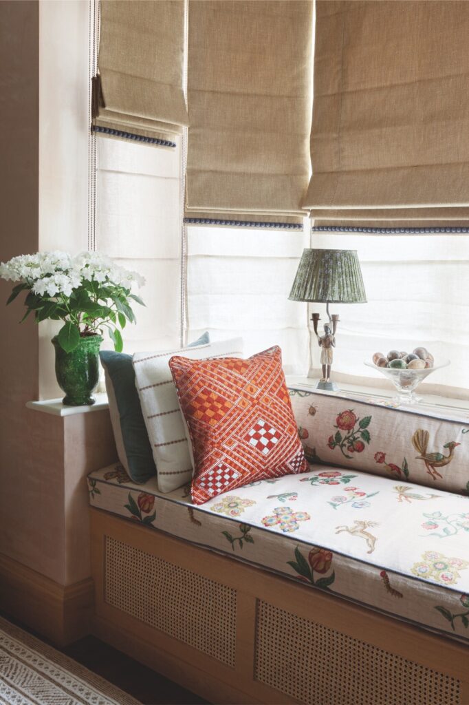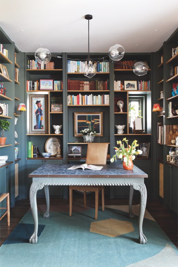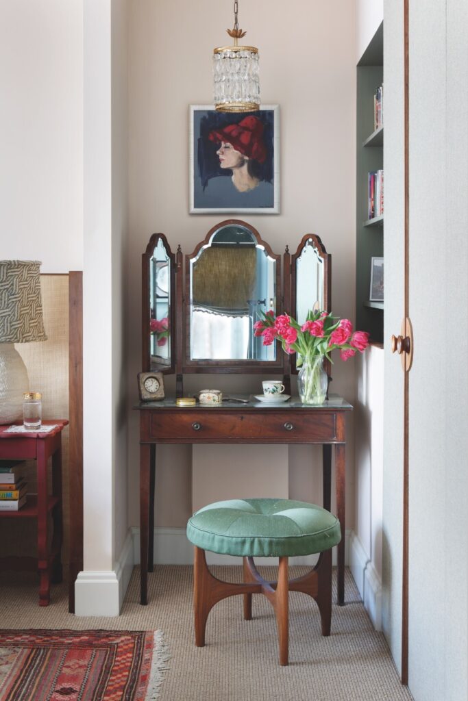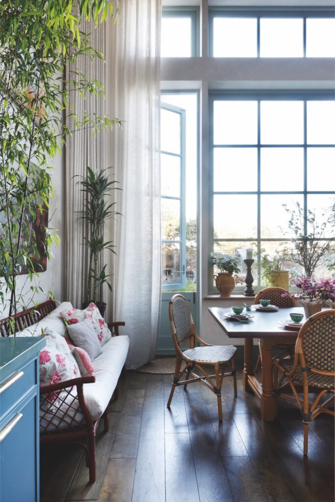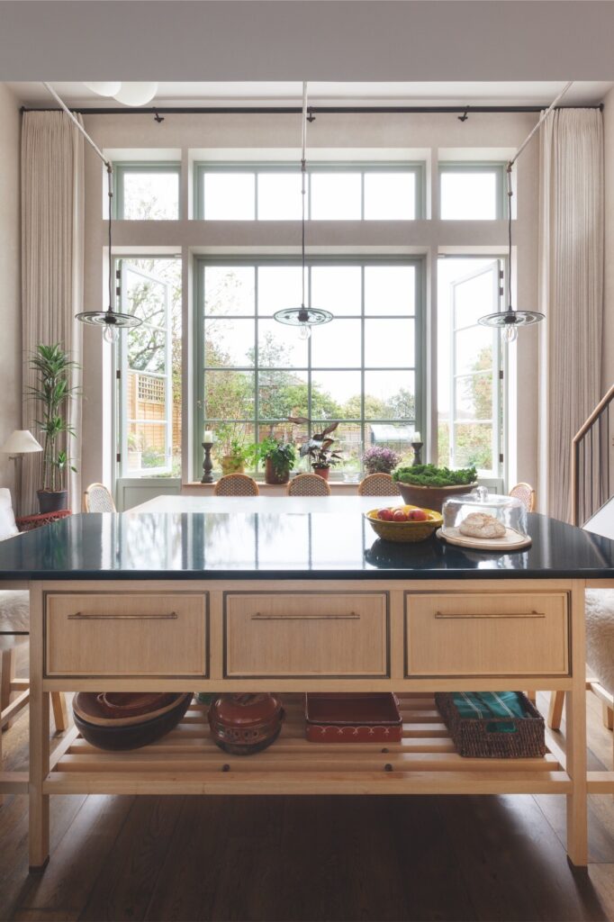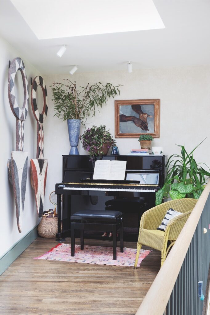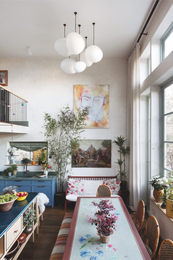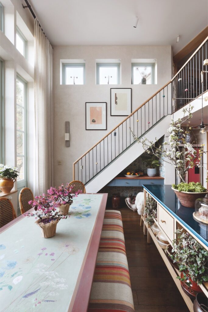 A partir daí, o espaço flui até ao mezanino destinado à música e à ioga, e todos os recantos, mesmo os mais pequenos, foram transformados num santuário tranquilo, com vista sobre o verdadeiro coração da residência: a cozinha — cuja mesa de refeitório é antiga, recuperada e pintada com flores do jardim, por Rosie Tatham.