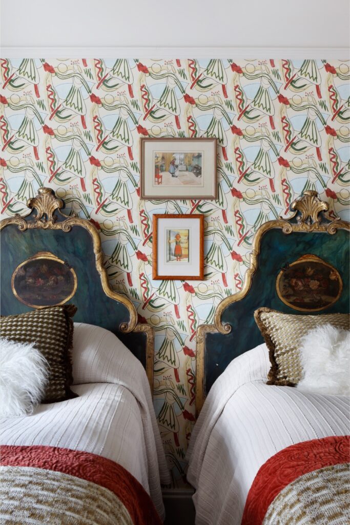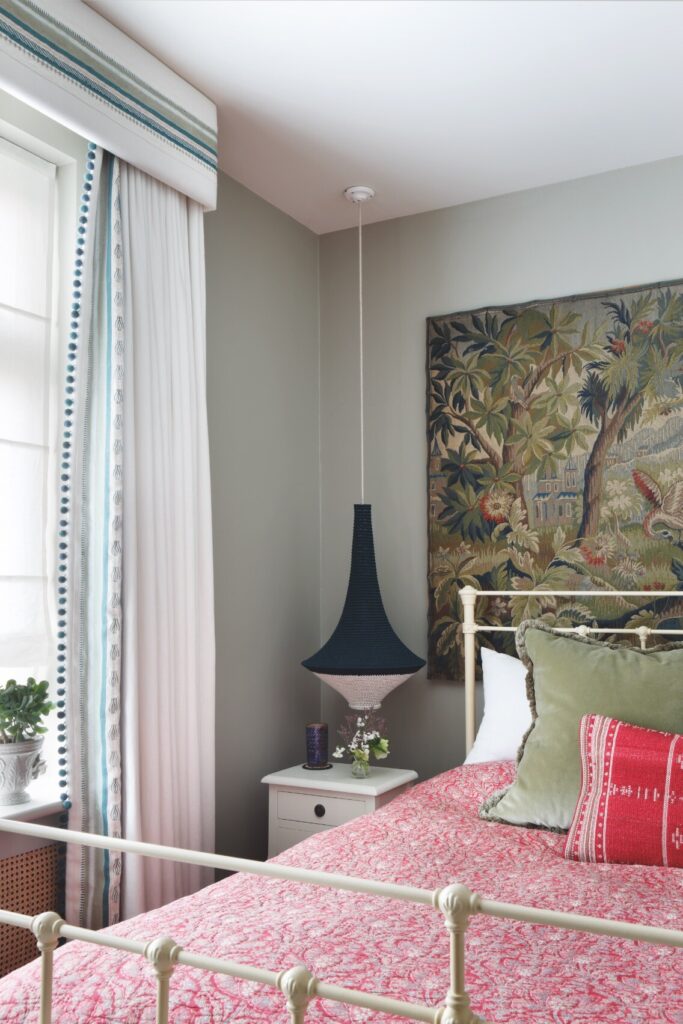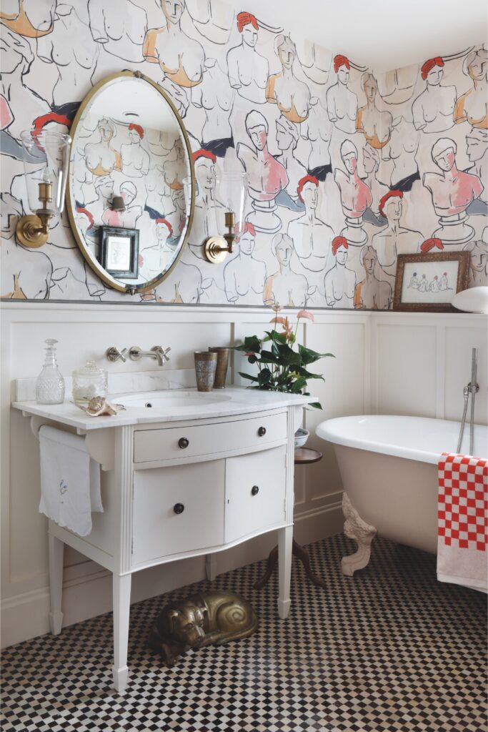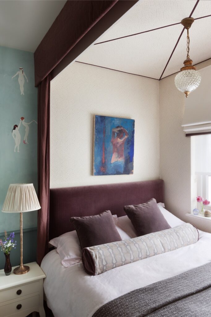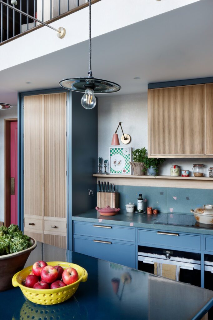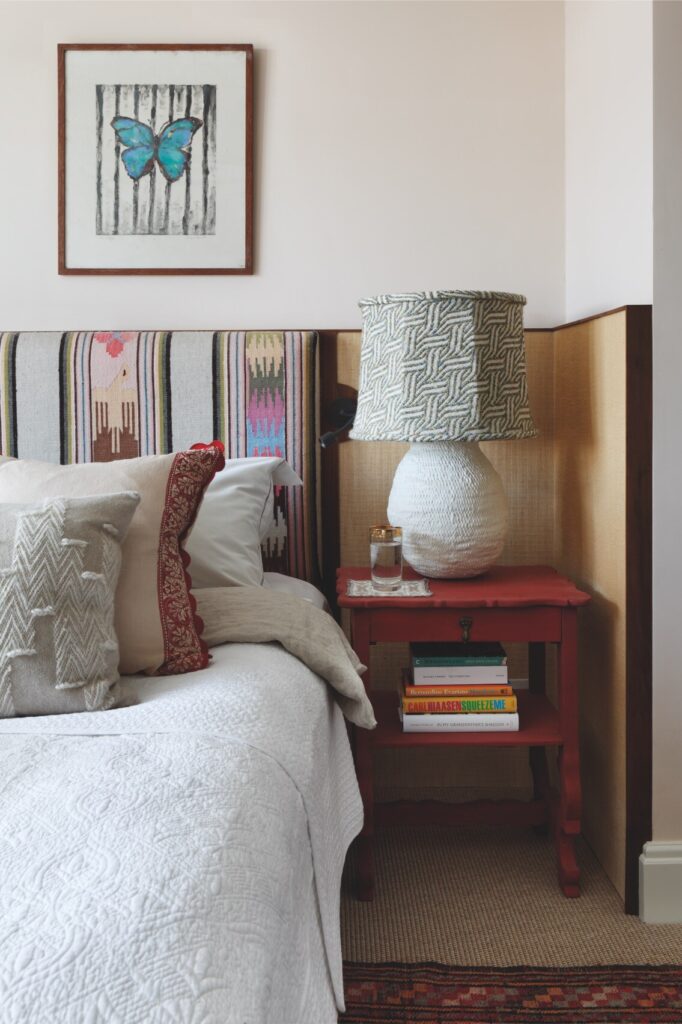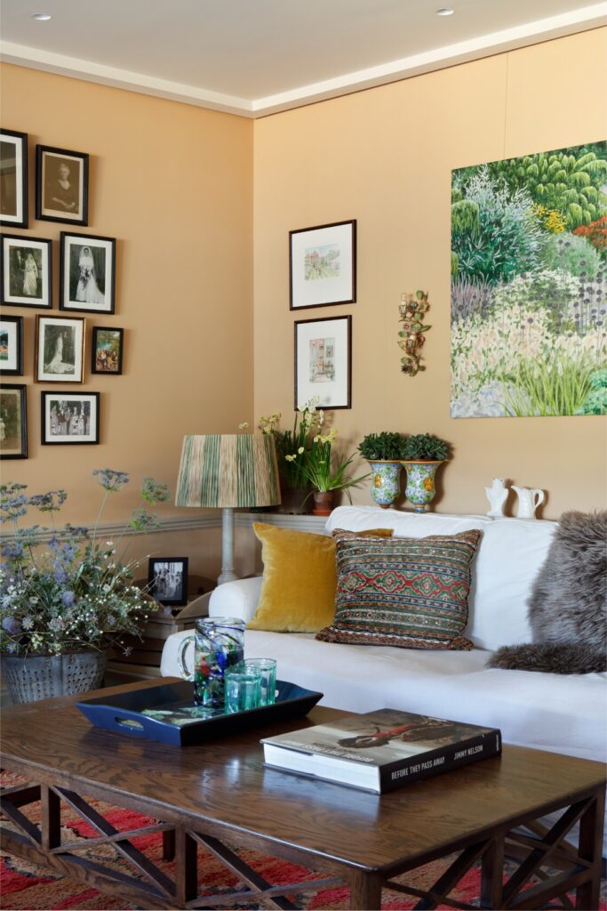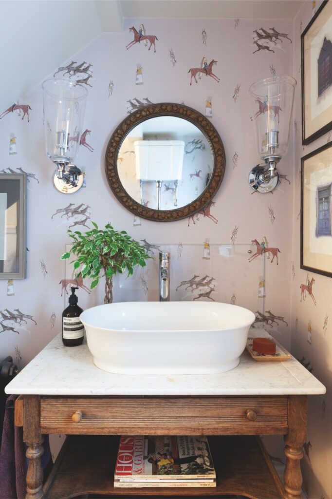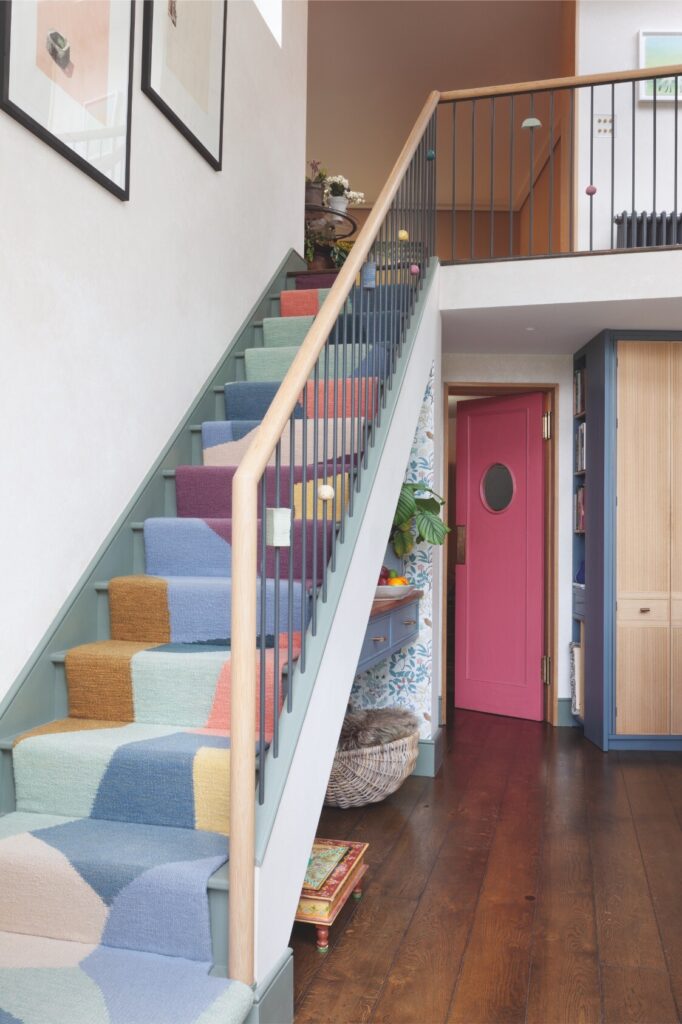 A partir daí, o espaço flui até ao mezanino destinado à música e à ioga, e todos os recantos, mesmo os mais pequenos, foram transformados num santuário tranquilo, com vista sobre o verdadeiro coração da residência: a cozinha — cuja mesa de refeitório é antiga, recuperada e pintada com flores do jardim, por Rosie Tatham.
