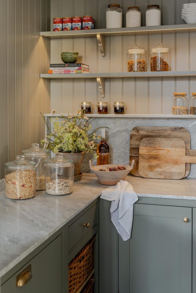 Implantada num terreno generoso, rodeado por jardins maduros, a habitação foi alvo de uma profunda reconfiguração espacial. No piso térreo, a compartimentação original deu lugar a um amplo espaço fluido que integra cozinha, sala de jantar e zona de estar — o verdadeiro coração da casa — pensado para acompanhar o ritmo das estações e da vida quotidiana. À chegada, um hall de entrada ampliado estabelece de imediato a atmosfera do projeto, enquanto uma despensa walk-in, com janelas de batente e presença escultórica, se afirma como um dos elementos mais distintivos da intervenção.