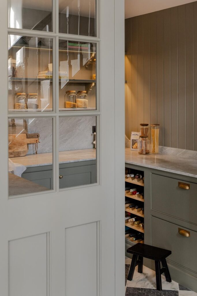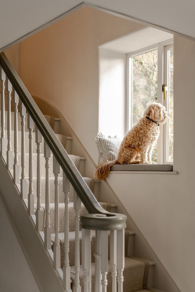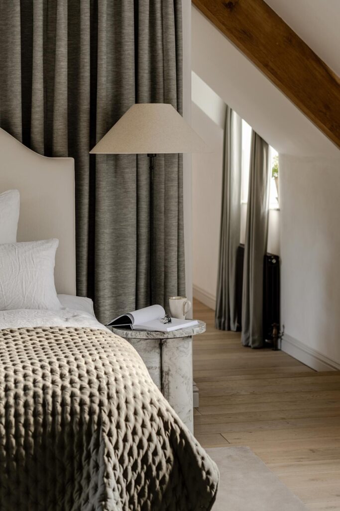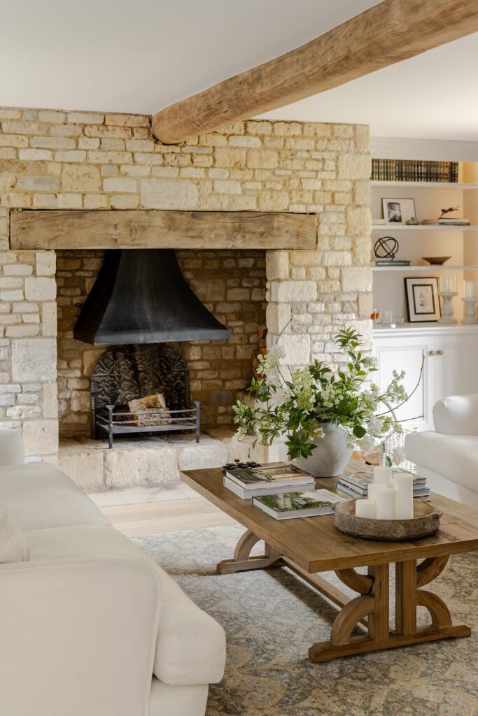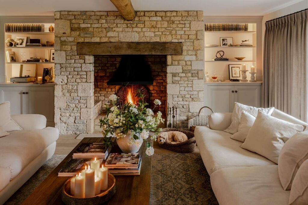 A intervenção equilibra com subtileza tradição e contemporaneidade. A solidez da pedra dos Cotswolds é complementada por caixilharias em carvalho e superfícies envidraçadas de inspiração industrial, que ampliam as vistas e potenciam a entrada de luz natural. Uma sala de estar mais formal, organizada em torno de uma lareira robusta em pedra, oferece um contraponto mais íntimo aos espaços sociais abertos.