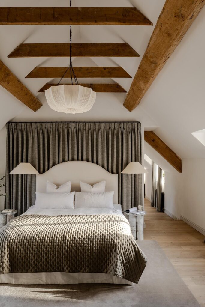 Os materiais desempenham um papel essencial na construção da atmosfera. Reboco de cal, painéis de madeira e pavimentos em madeira recuperada criam uma base sensorial rica e uma linguagem estética que se mantém fiel ao imaginário rural, mas com uma abordagem depurada e atual.