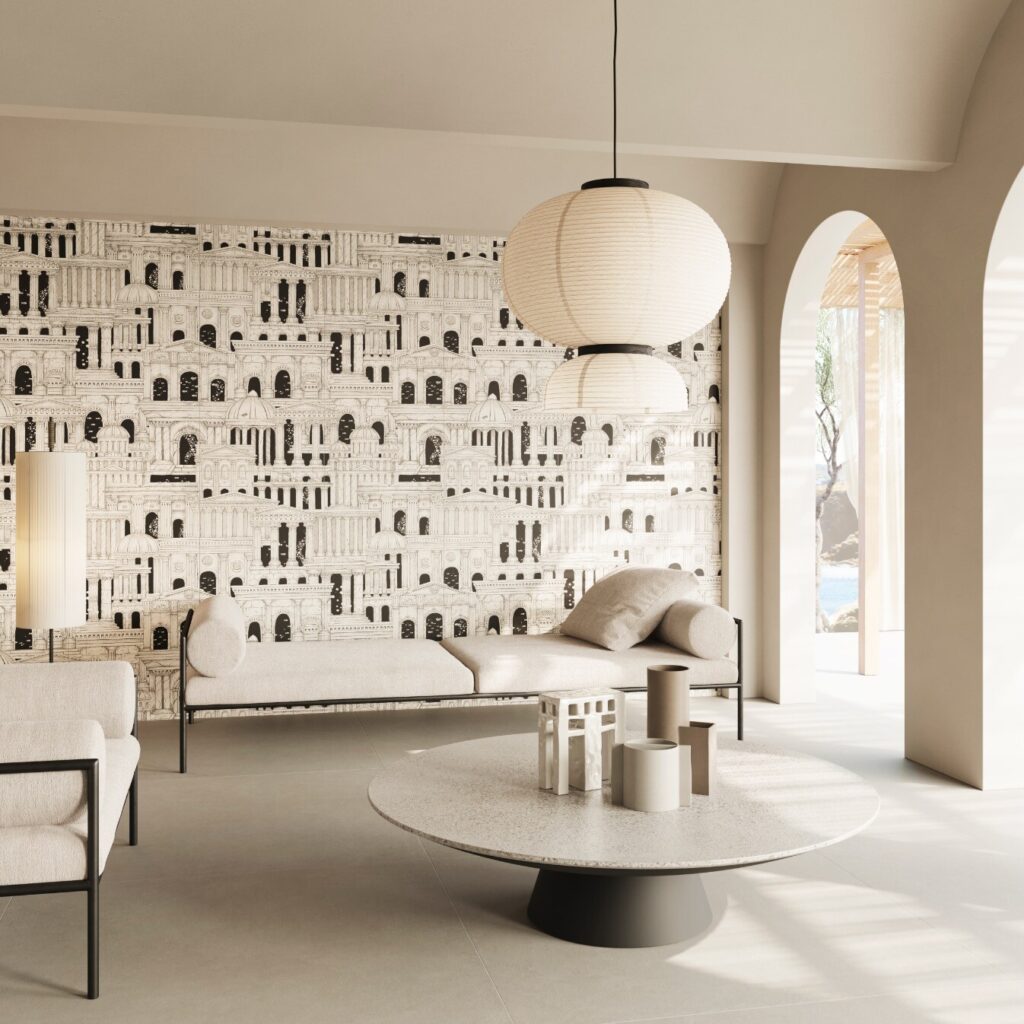 A coleção apresenta superfícies cerâmicas no formato 60×120 cm, com base Colorama e decorações impressas em relevo a frio — uma tecnologia que cria um efeito tátil, envolvente e expressivo.