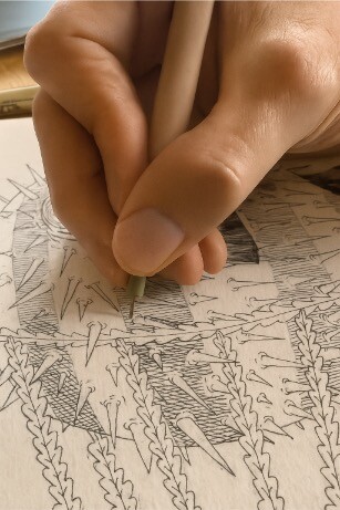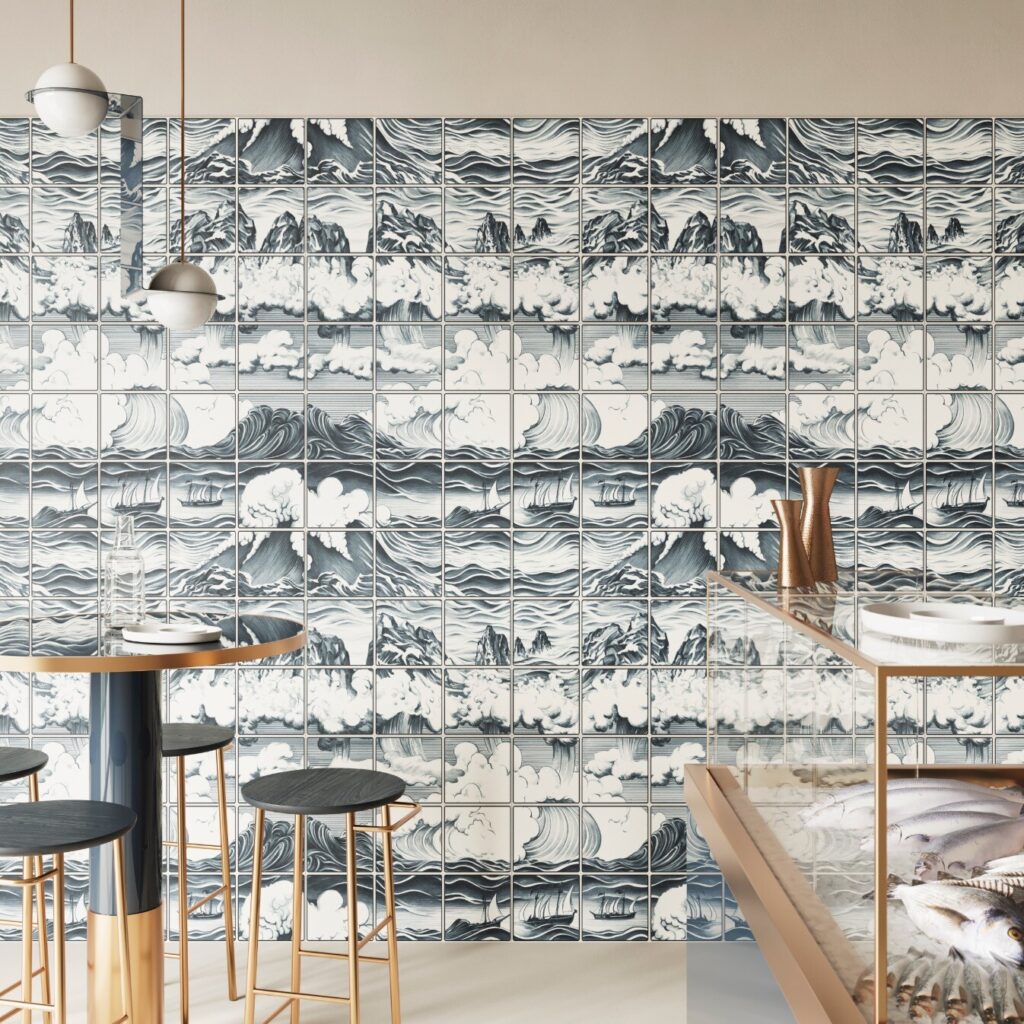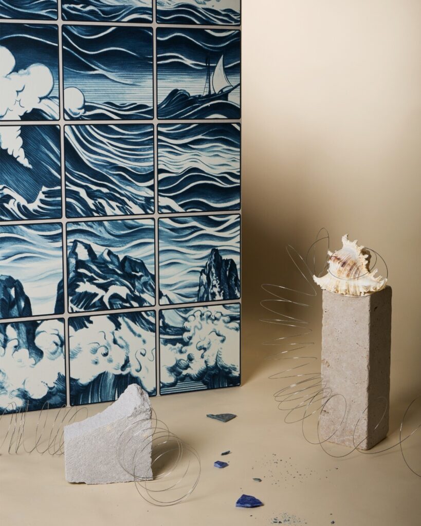 Em Sea Majolica, ondas, nuvens e pedras entrelaçam-se num padrão que remete para os tradicionais azulejos portugueses de majólica 20×20, reinterpretados graficamente numa única peça de 60×120 cm. Em tons profundos de azul, embarcações navegam por ilusões óticas num mar que se transforma em céu.