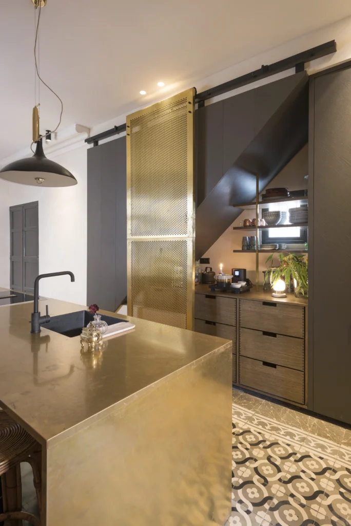 Um corredor antes sobredimensionado e ineficiente é redefinido como a nova cozinha, agora organizada em torno de uma generosa ilha — tornando-se o coração da casa, um lugar de encontro e continuidade.
