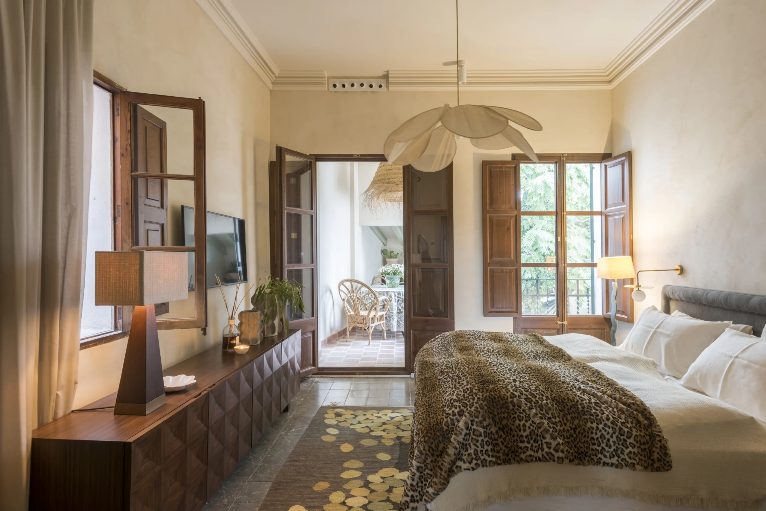 A antiga despensa transforma-se num refúgio exterior coberto, uma extensão íntima da suíte principal que se abre para o pátio interior.
