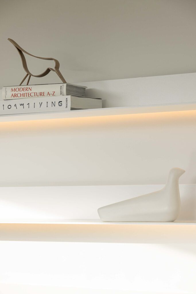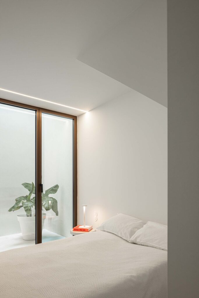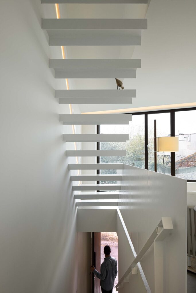Ao nível da rua, a madeira estabelece proximidade e humaniza a presença do edifício, criando uma relação direta com o quotidiano. Nos pisos superiores, o cerâmico branco evoca, de forma subtil e depurada, a tradição local, numa leitura quase abstrata da memória azulejar de Aveiro. A casa organiza-se em dois níveis voltados a poente, perseguindo a luz como elemento estruturante. Um pátio vertical abre o interior ao céu e permite que a luminosidade percorra a casa, enquanto um gesto linear de luz atravessa o espaço, guiando o olhar e instaurando uma sensação de calma.